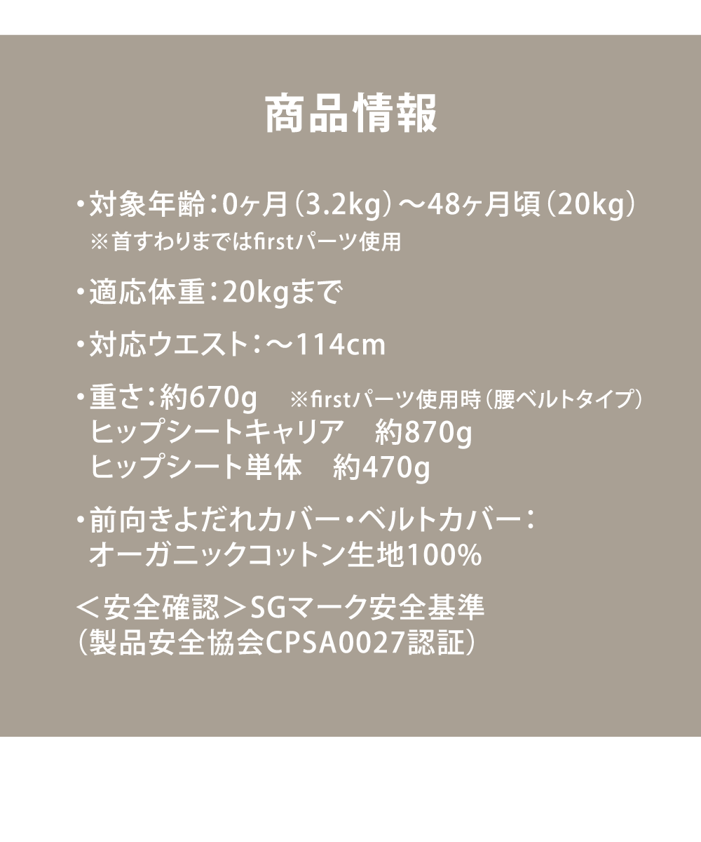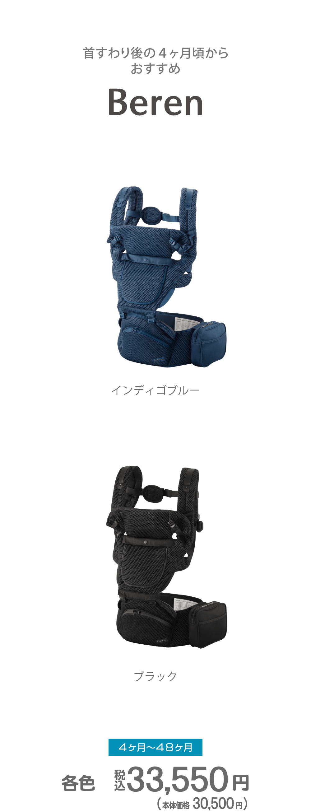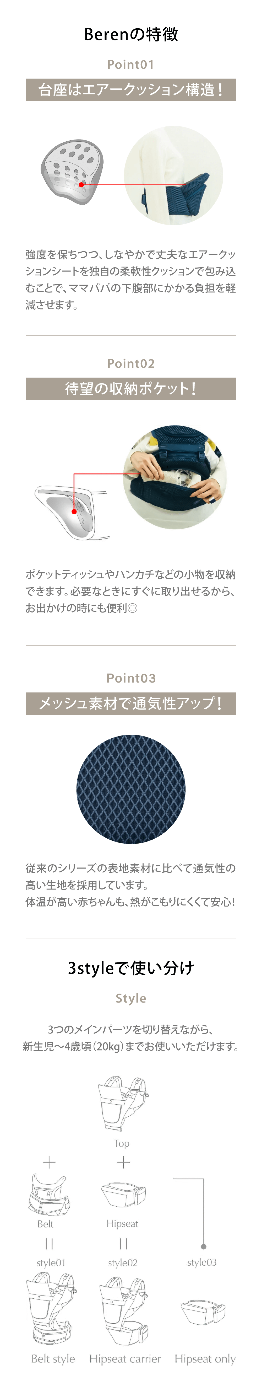 Beren firstセットは、3style 9wayで新生児期~抱っこ卒業 (20kg) までお使いいただけます。