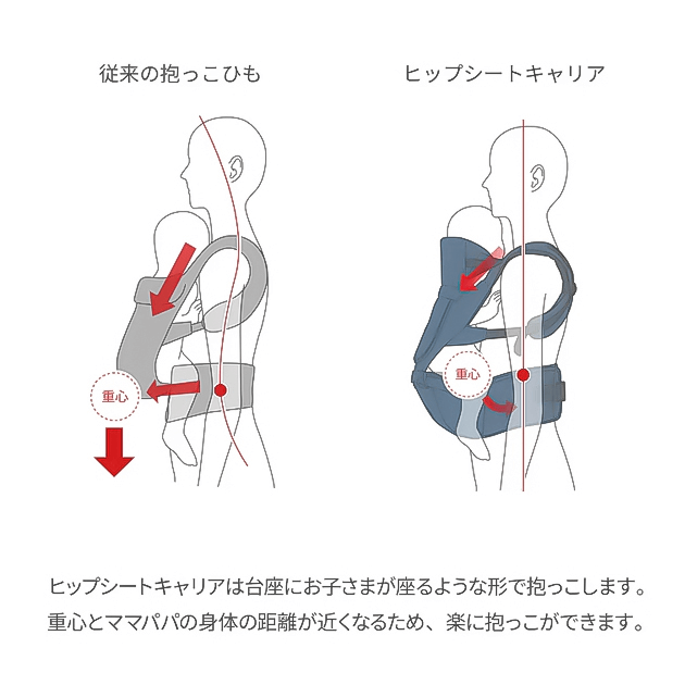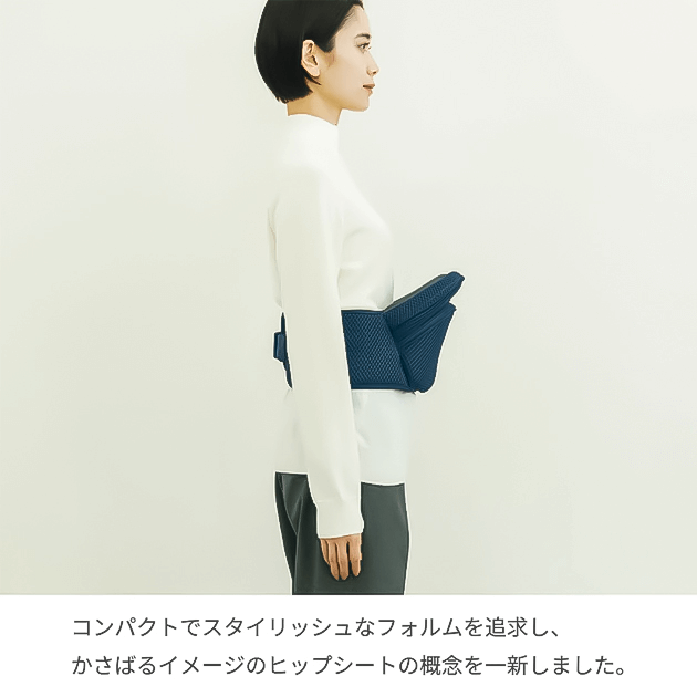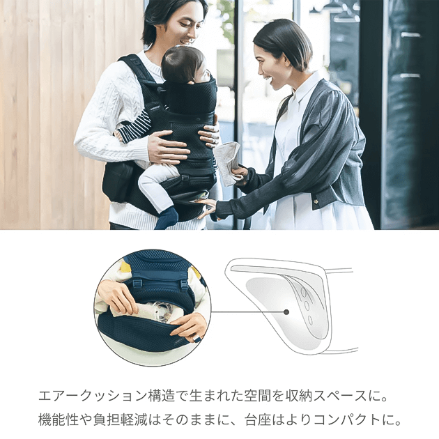 台座がお子さまの体重を支え、重さを分散し、肩と腰の負担を軽減!コンパクトでスタイリッシュな台座は収納スペースもあり機能的。適度な距離感で抱っこすることができます。