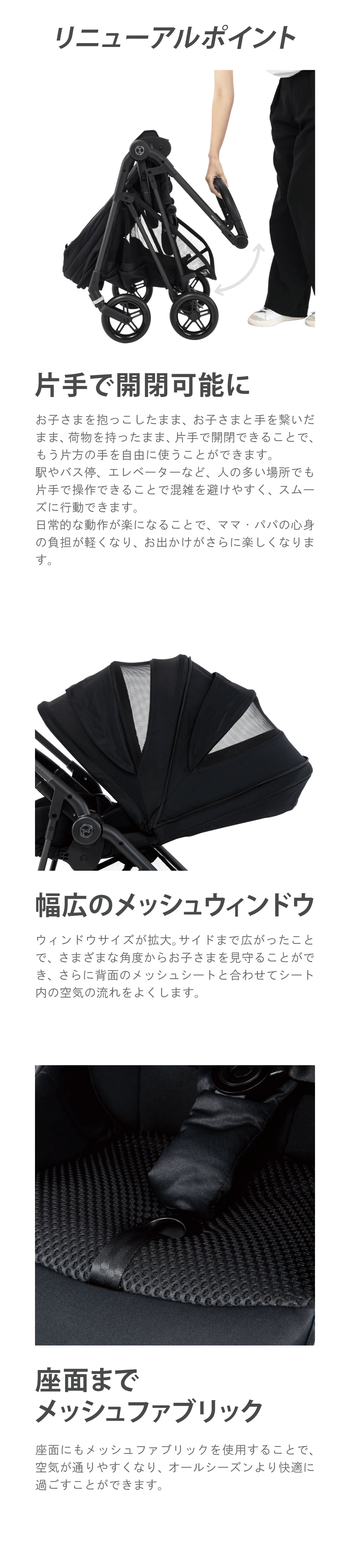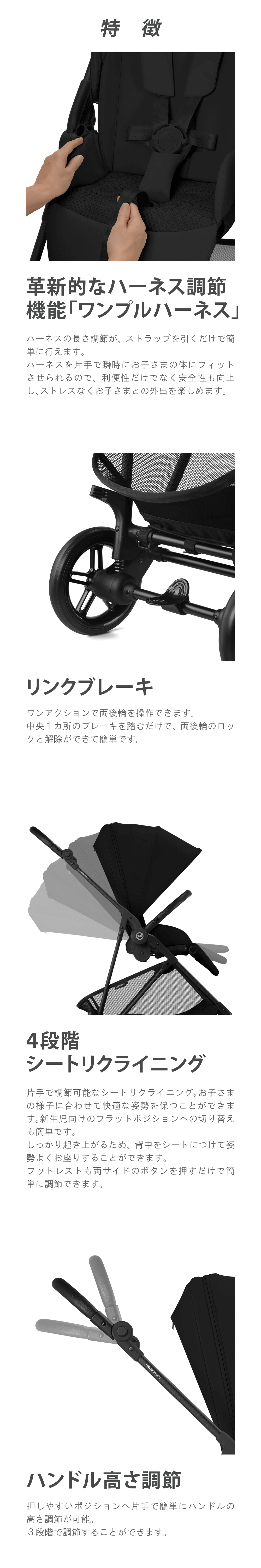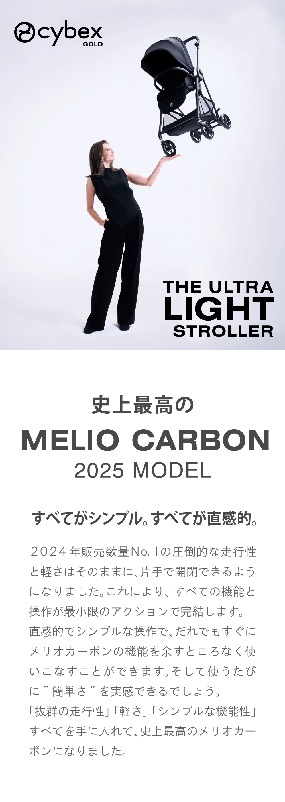 2024年販売数量No.1*の圧倒的な走行性と軽さはそのままに、片手で開閉できるようになりました。これにより、すべての機能と操作が最小限のアクションで完結します。 お子さまを抱っこしながらできる「片手開閉」、瞬時にハーネス調節可能な「ワンプルハーネス」、ワンアクションで両後輪が操作できる「リンクブレーキ」、片手で調節可能な「リクライニングシート」など、直感的でシンプルな操作で、だれでもすぐにメリオカーボンの機能を余すところなく使いこなすことができます。そして使うたびに”簡単さ”を実感できるでしょう。 「抜群の走行性」「軽さ」「シンプルな機能性」すべてを手に入れて、史上最高のメリオカーボンになりました。