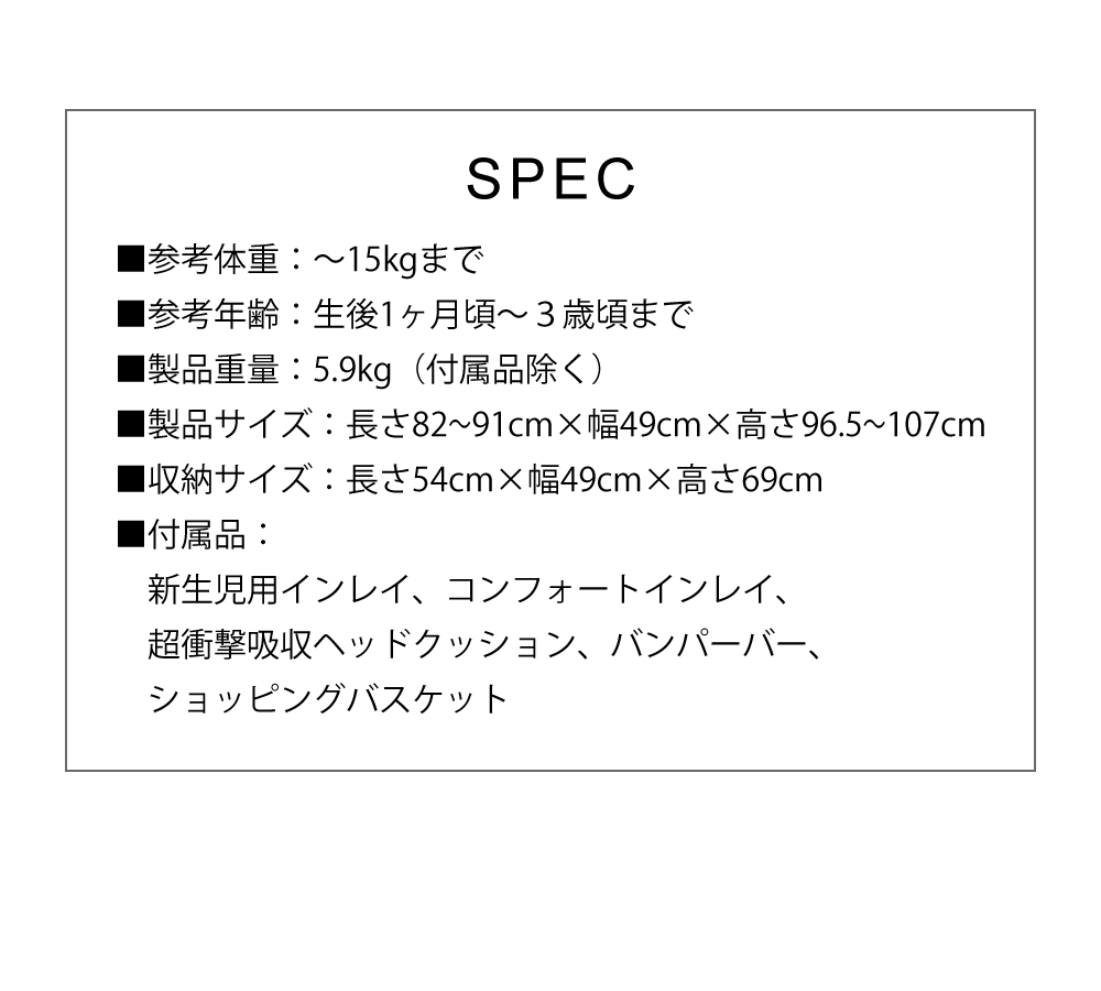 【付属品】新生児用インレイ、コンフォートインレイ、超衝撃吸収ヘッドクッション、バンパーバー、ショッピングバスケット