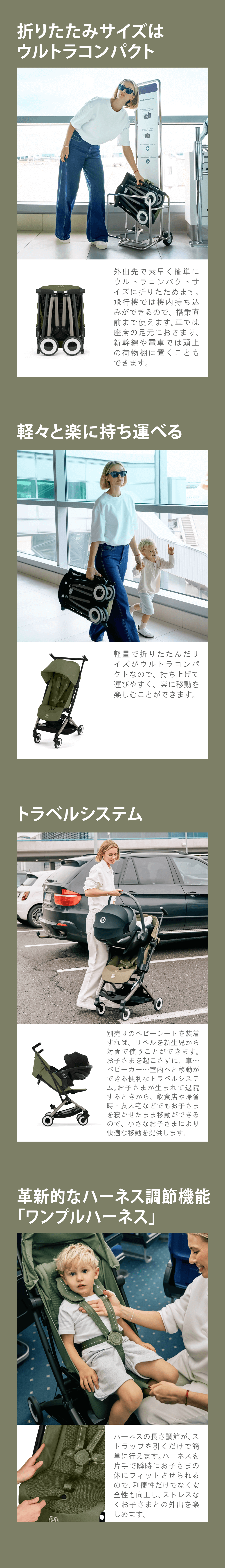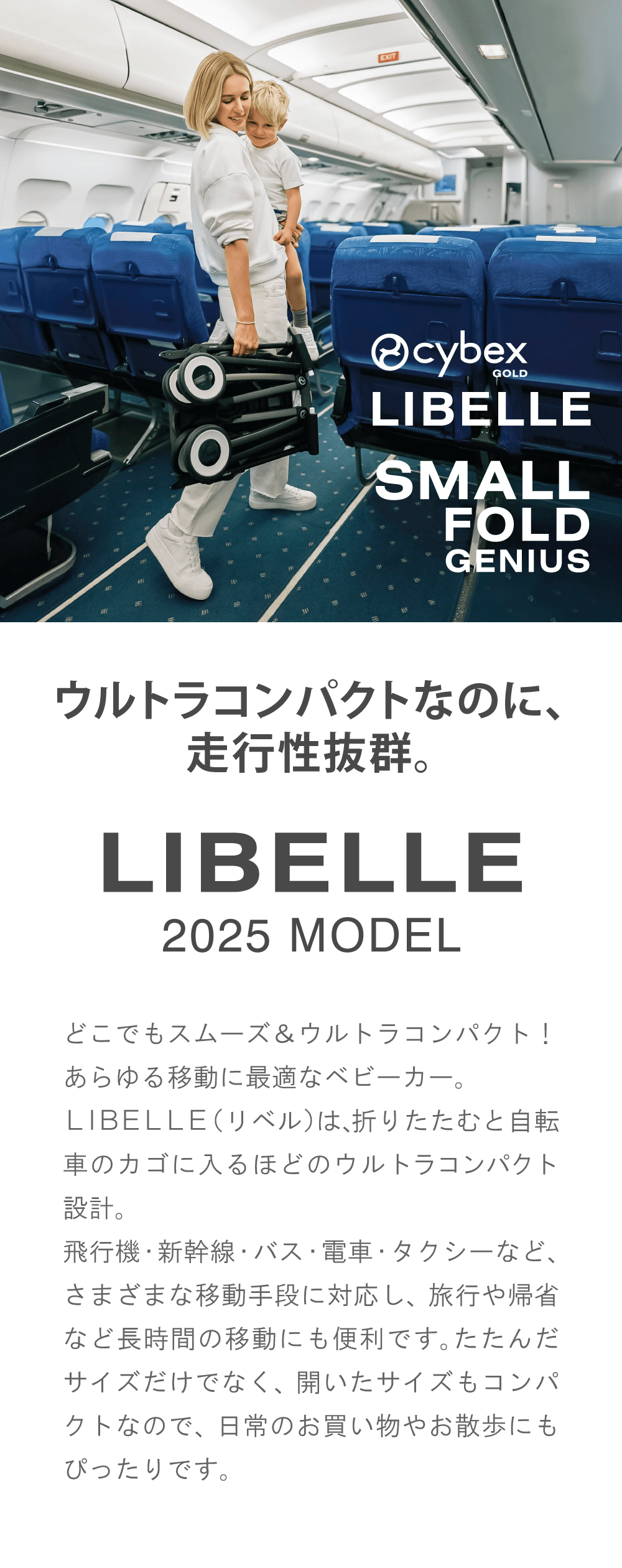 LIBELLE(リベル)は、折りたたむと自転車のカゴに入る*ほどのウルトラコンパクト設計。飛行機・新幹線・バス・電車・タクシーなど、さまざまな移動手段に対応し、旅行や帰省など長時間の移動にも便利です。たたんだサイズだけでなく、開いたサイズもコンパクトなので、日常のお買い物やお散歩にもぴったりです。 それでいて、走行性は抜群!ワイドハンドル+ダブルグリップ設計により、力が効果的に前輪へ伝わり、操作性が向上。さらに、「ストレートフレーム構造**」を採用し、スムーズなハンドリングと安定した走行を実現しました。軽い力で瞬時に方向転換が可能なため、狭い道や人混みでもスムーズに進むことができます。 日常から旅行まで、移動をもっと楽しく、もっと自由に。