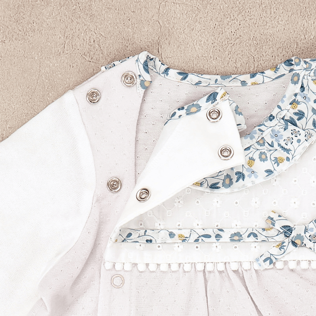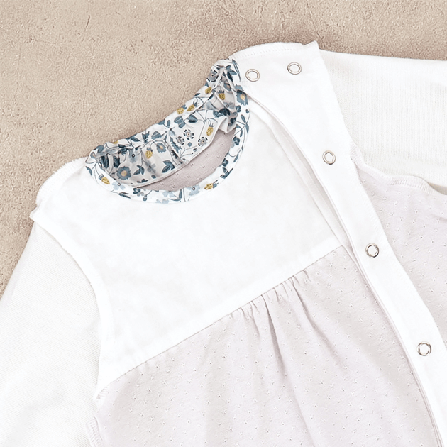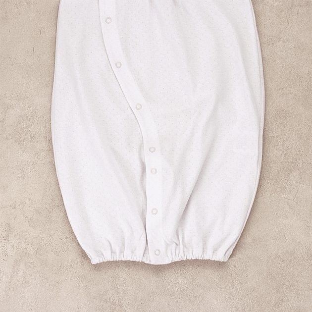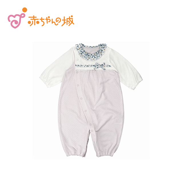 やわらかく吸水性のある天竺素材で、春から秋先まで活躍します。生まれてすぐは足を包むドレスタイプ。足をばたばた出来るようになったらボタンを留め替えて、カバーオールタイプにもなるツーウェイ仕様です。