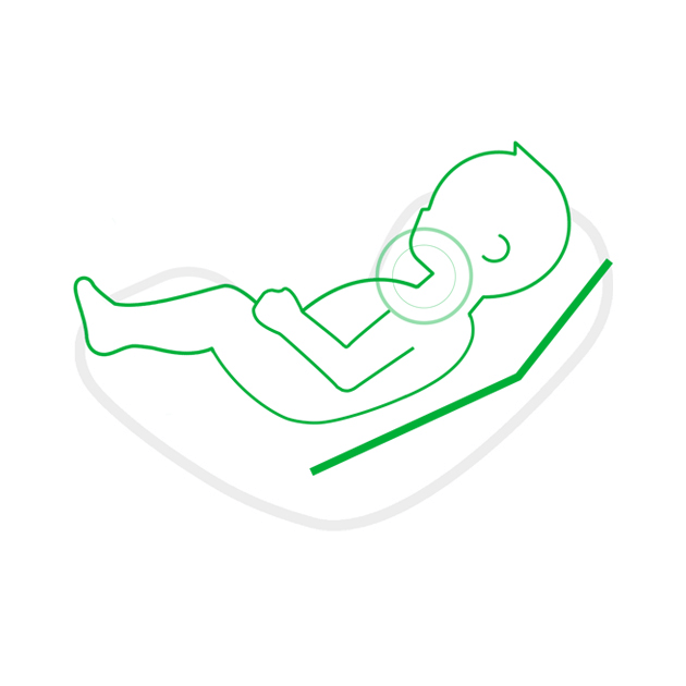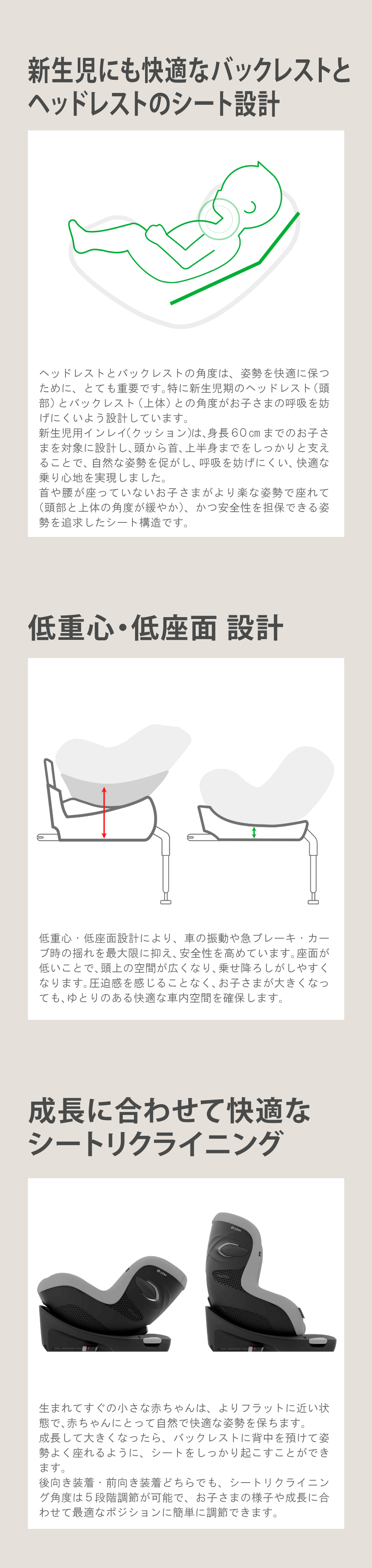 ヘッドレストとバックレストの角度は、姿勢を快適に保つために、とても重要です。特に新生児期のヘッドレスト(頭部)とバックレスト(上体)との角度がお子さまの呼吸を妨げにくいよう設計しています。 新生児用インレイ(クッション)は、身長60cmまでのお子さまを対象に設計し、頭から首、上半身までをしっかりと支えることで、自然な姿勢を促がし、呼吸を妨げにくい、快適な乗り心地を実現しました。 首や腰が座っていないお子さまがより楽な姿勢で座れて(頭部と上体の角度が緩やか)、かつ安全性を担保できる姿勢を追求したシート構造です。
