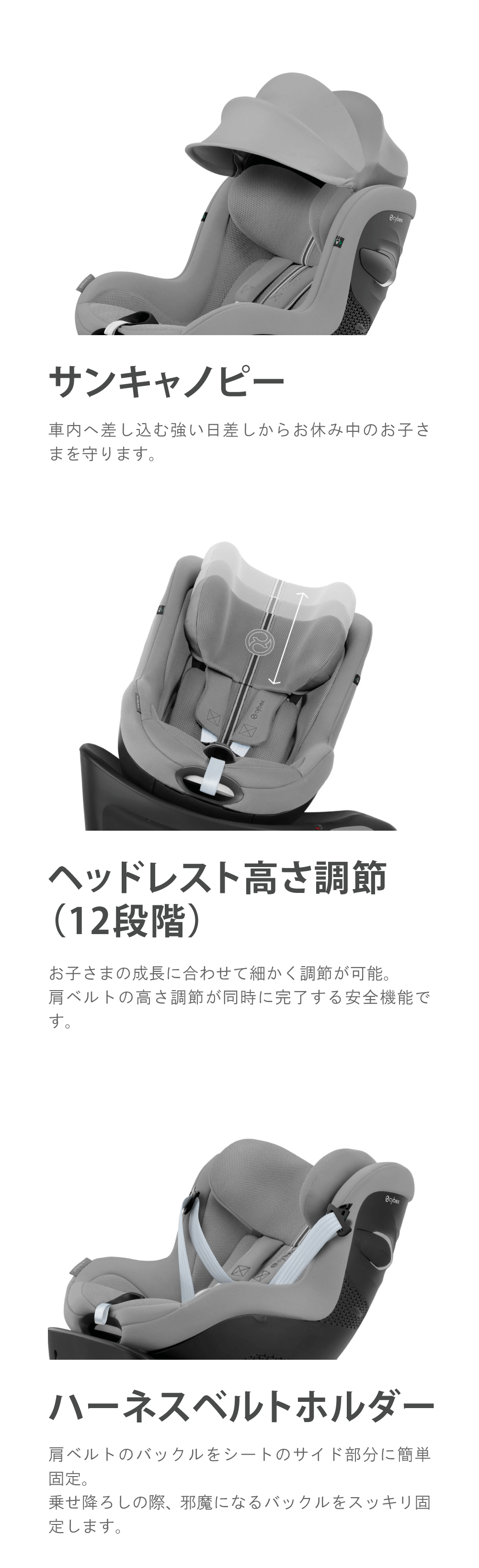 360°回転機能は、お子さまを乗せる際の腰の負担を軽減します。シートをドア側に回転させることで、お子さまを乗せるのも、降ろすのも簡単です。また、後向きと前向きの切り替えも簡単にできます。 《最も安全な姿勢での快適な移動》 後向き装着は、正面衝突の際にお子さまの安全性を高めます。後向き装着では、前面衝突の力がチャイルドシートシェルに分散されます。 お子さまが生後15ヶ月以上、身長76cm以上になるまでは、後向き装着での走行が義務付けられています。しかし、CYBEXでは、できるだけ長い期間後向き装着でご使用いただくことをお勧めしています。