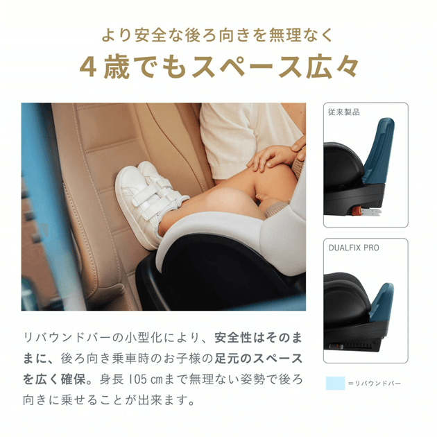 リバウンドバーの小型化により、安全性はそのままに後ろ向き乗車時のお子様の足元スペースを広く確保。身長105?まで無理のない姿勢で後ろ向きに乗せられます。