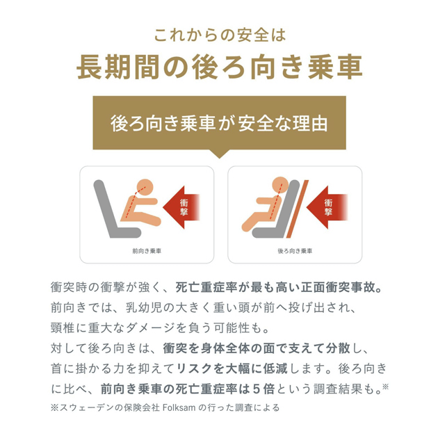 衝突時のエネルギーが強く、死亡重症率が最も高い正面衝突事故。前向きでは、乳幼児の大きく重たい頭が強い力で前方へ投げ出され、頸椎に重大なダメージを負ってしまう可能性があります。後ろ向きに乗せる事で衝突に対し身体全体を面で支え、衝撃を分散し、首に掛かる力を抑え、重傷受傷リスクを大幅に低減します。