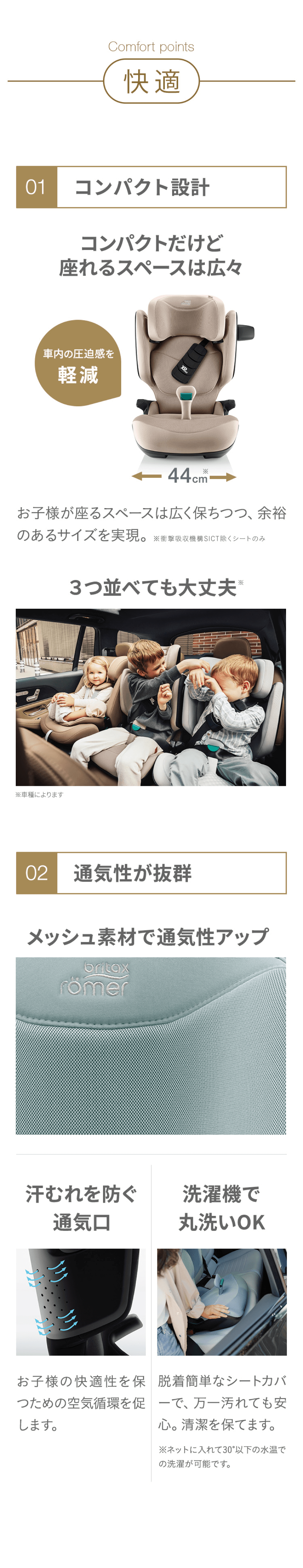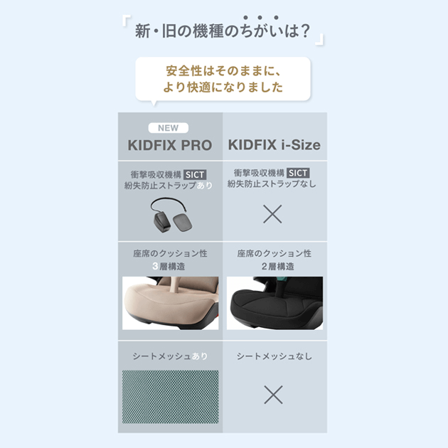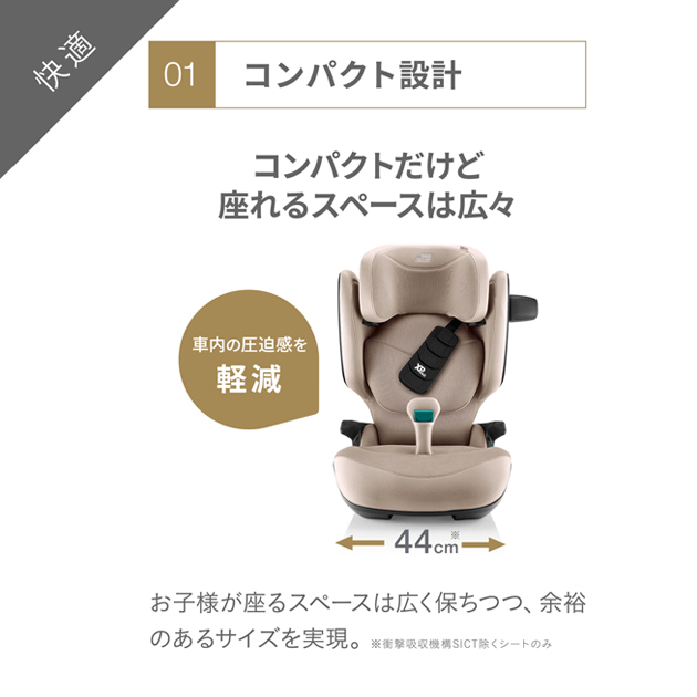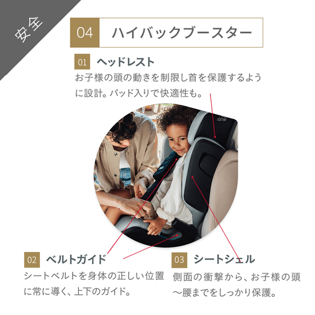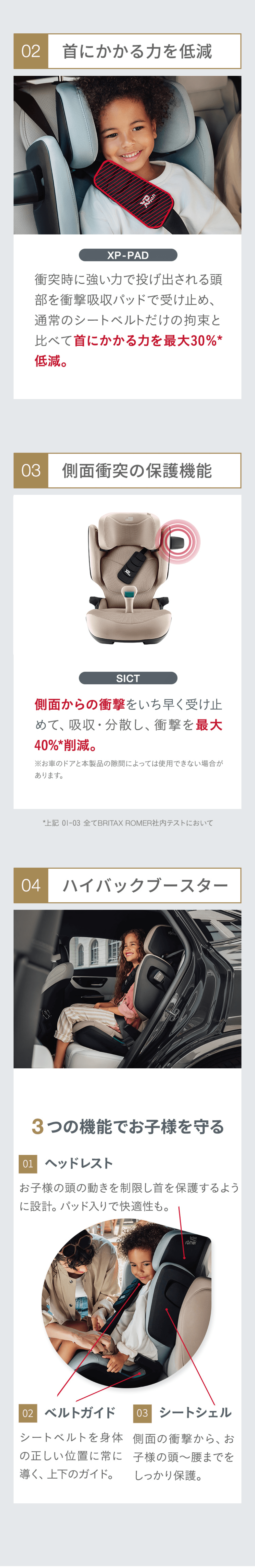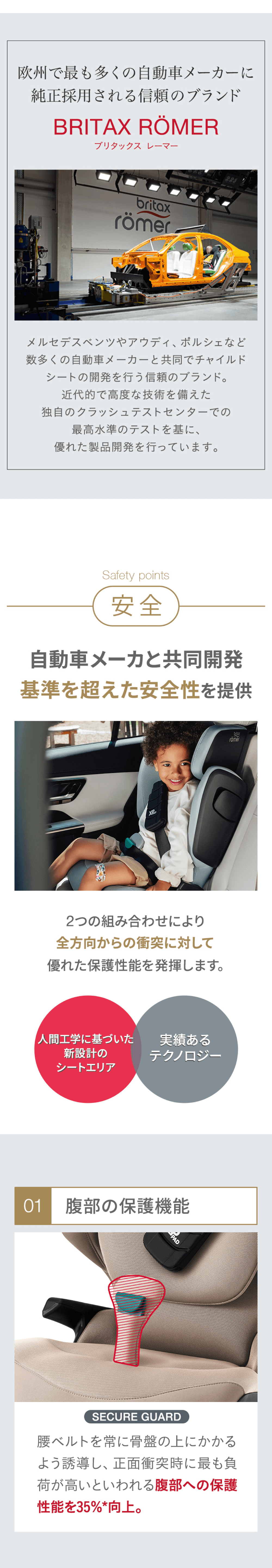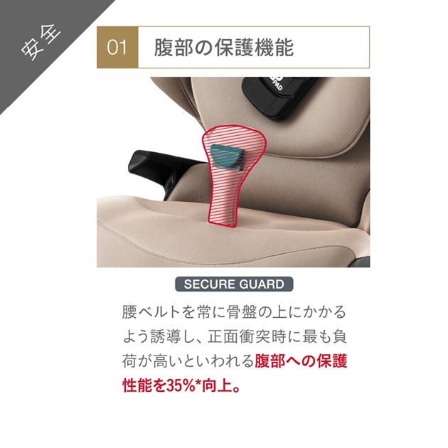 腰シートベルトを常にお子様の骨盤の位置に保つことにより、正面衝突の際の腹部に掛かる衝撃を最大35%※削減すると同時に、お子さまのお腹へのベルトの圧迫も軽減します。