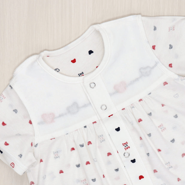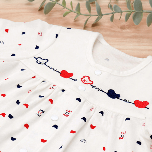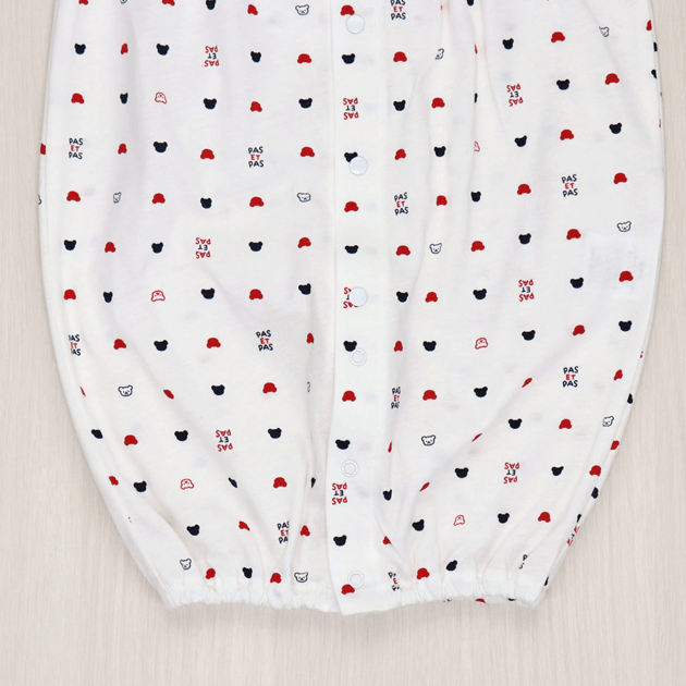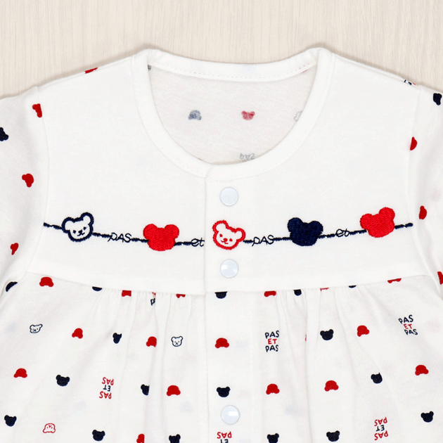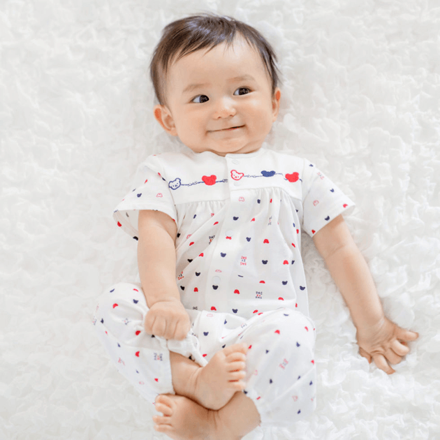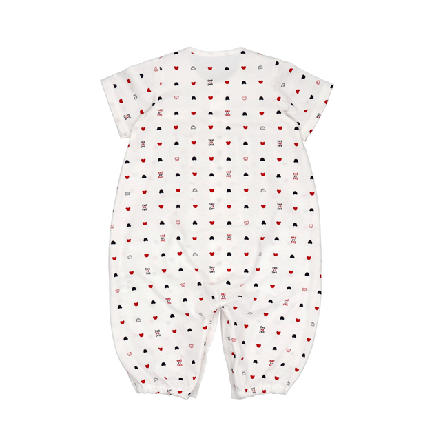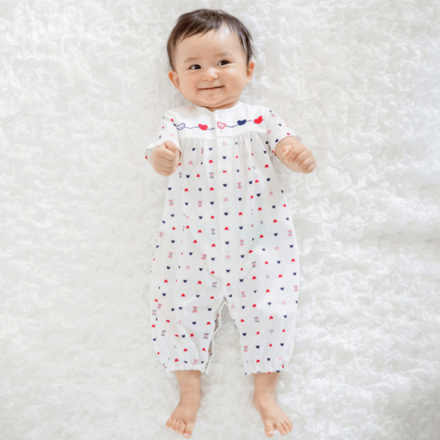 赤と紺のさわやかなトリコロールカラーのくまさん柄は、男女問わずお使い頂けます。 ツーウェイオールに夏用の半袖タイプが新登場。袖が短いので涼しく、脇下の汗はしっかり吸い取ってくれます。薄い編地で、さらっとした肌触りが気持ちいい天竺素材を使用しています。 生まれてすぐは足を包むドレスタイプ。 足をばたばた出来るようになったらボタンを留め替えて、カバーオールタイプにもなるツーウェイ仕様です。
