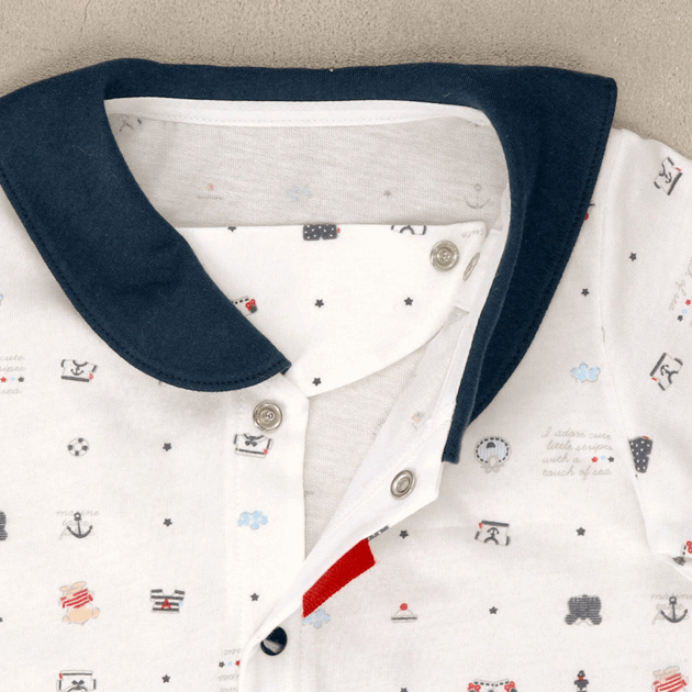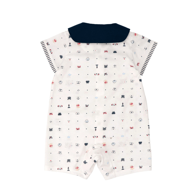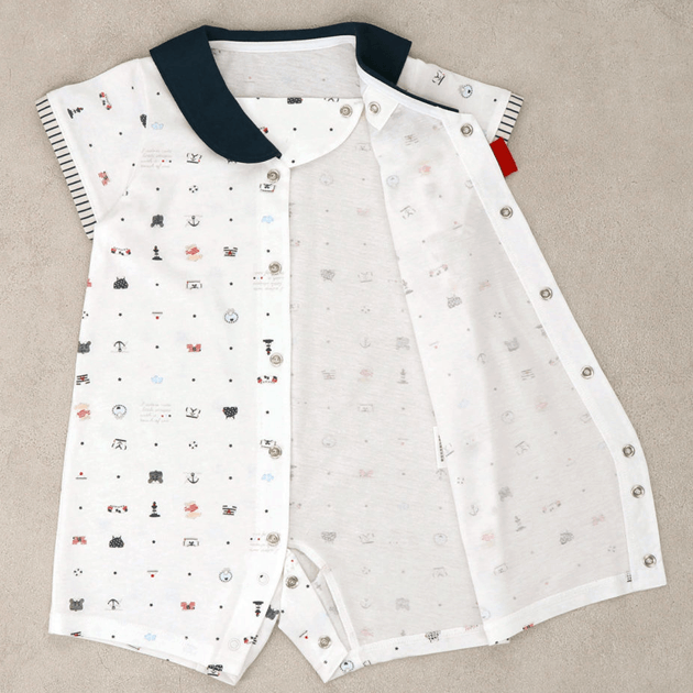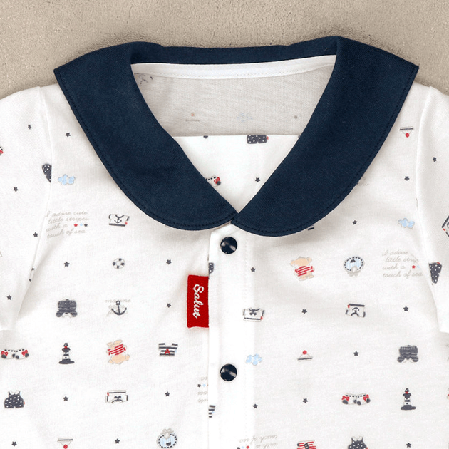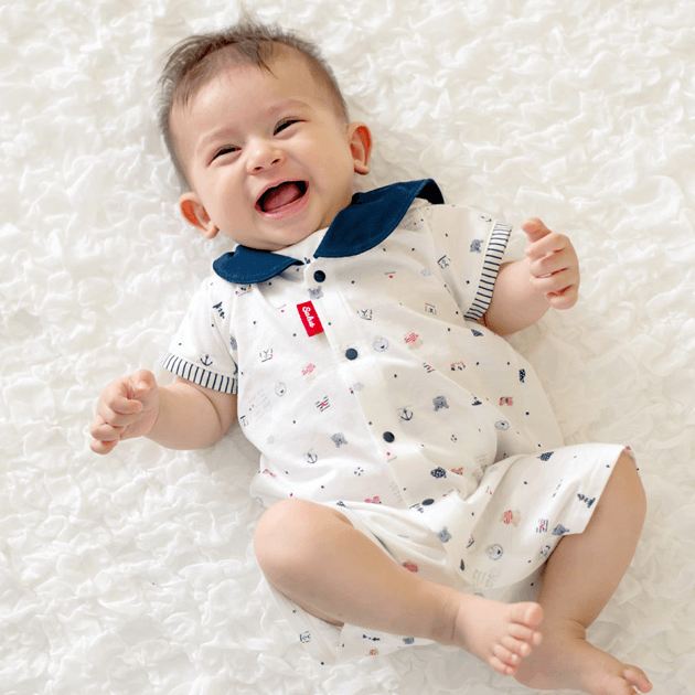 プリント柄が可愛いマリンデザインは夏にぴったり! 軽くて薄い編地でさらっとした肌触りが気持ちいい天竺素材に薄手のローン生地は暑い季節ににおすすめです。 おなかが出ないロンパースは元気いっぱいな赤ちゃんにおすすめです。