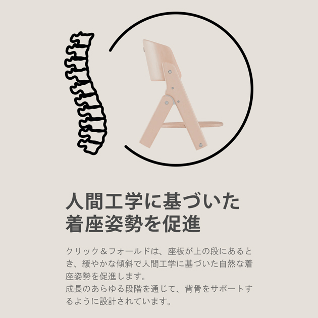 クリック&フォールドは、座板が上の段にあるとき、 緩やかな傾斜で人間工学に基づいた自然な着座姿勢を促進します。