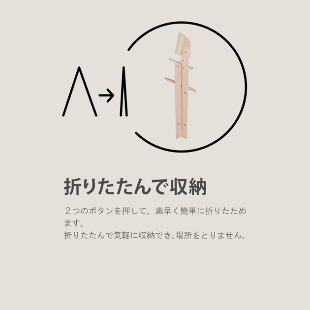 2つのボタンを押して、素早く簡単に折りたためるので、気軽に収納でき場所をとりません。