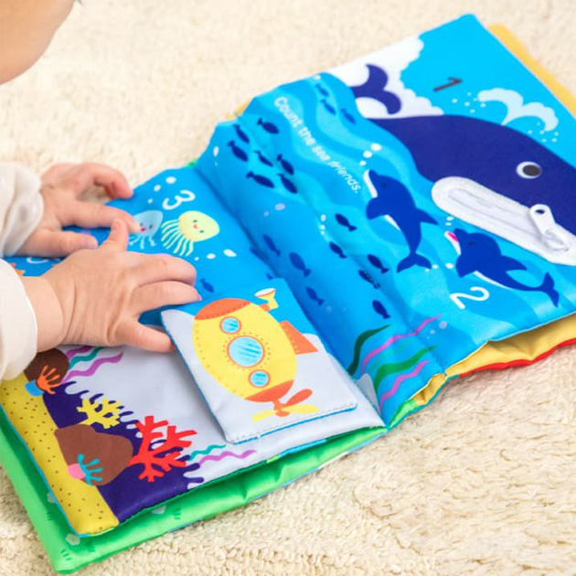 ファーストトイにぴったり!リボン結び、ジッパーの開閉、ボタンがけの他、数字カウントや形あそび・子どもが大好きなミラーなど、しかけが 盛りだくさんの布絵本です。しかけ遊びを通して、くらしの中で必要な手の動かし方や知識を楽しみながら自然と 学ぶことができます。持ち運びに便利な持ち手つきで、お部屋の中はもちろんおでかけ先でも楽しめます。洗濯機のソフト洗いコースや手洗いができるので衛生的。清潔に保てるので気軽に遊べたり布の優しい肌触りを楽しめたりとファーストトイにおすすめです♪