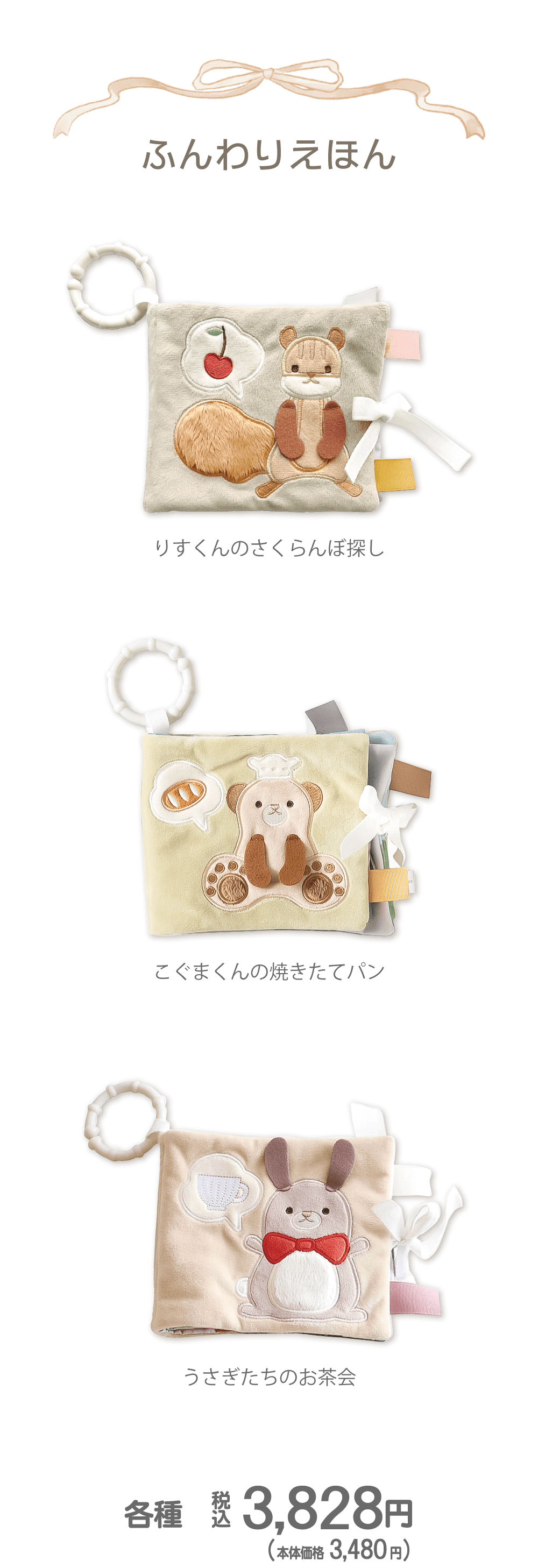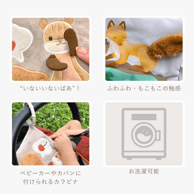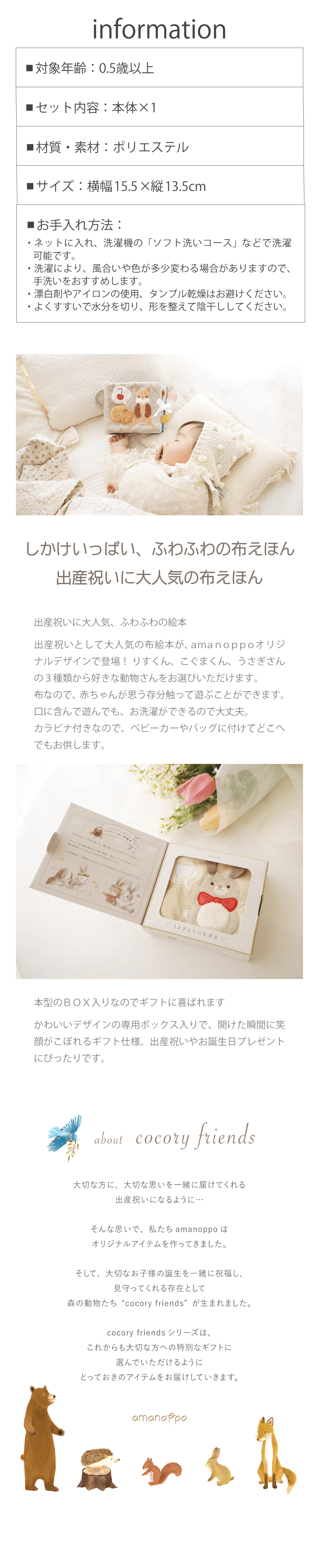 出産祝いとして大人気の布絵本が、amanoppoオリジナルデザインで登場! りすくん、こぐまくん、うさぎさんの3種類から好きな動物さんをお選びいただけます。 布なので、赤ちゃんが思う存分触って遊ぶことができます。