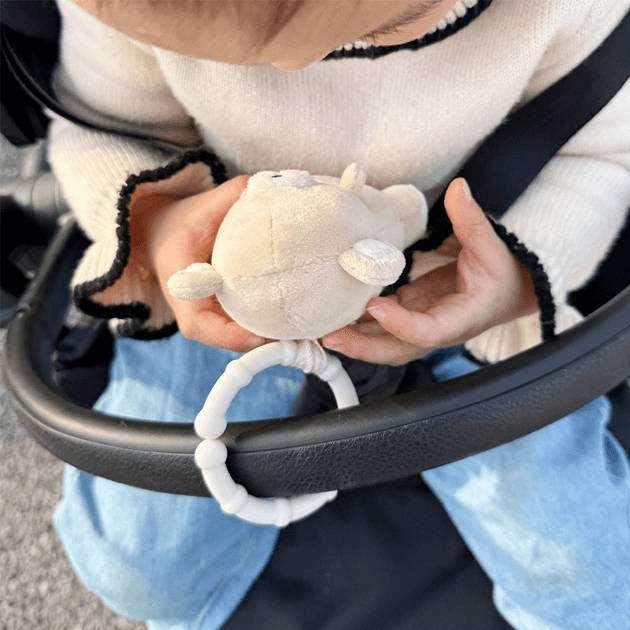 付属のカラビナでベビーカーやカバンにつけて、いつでもどこへでもいっしょに寄り添います。