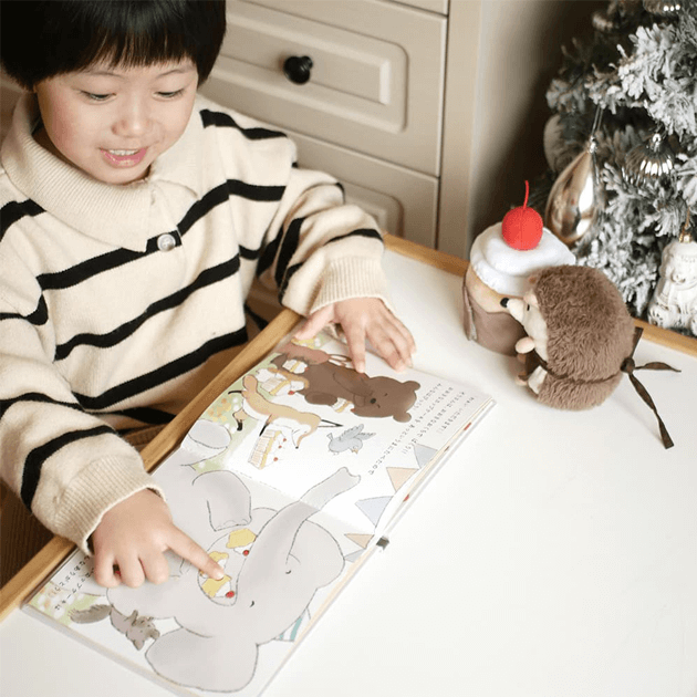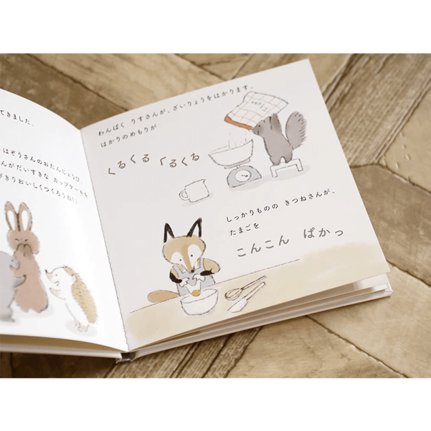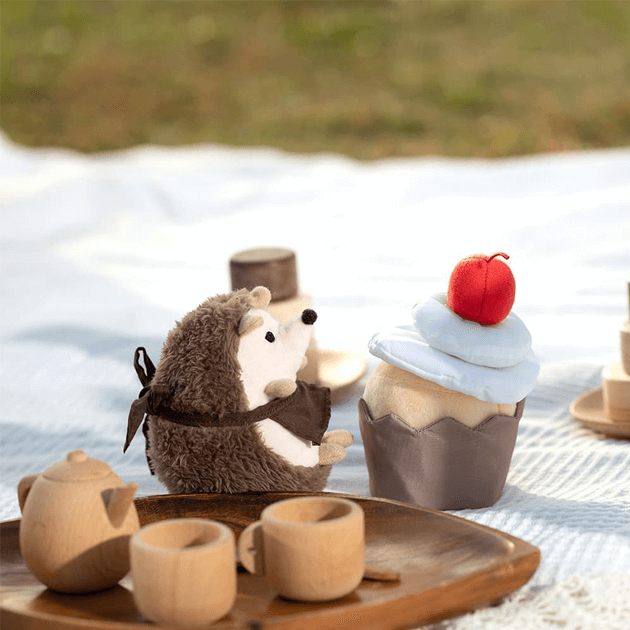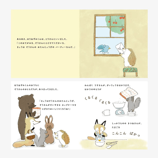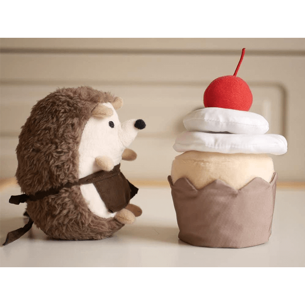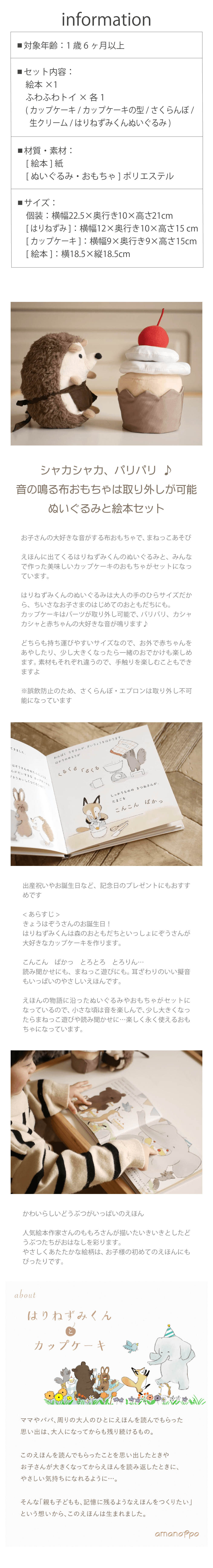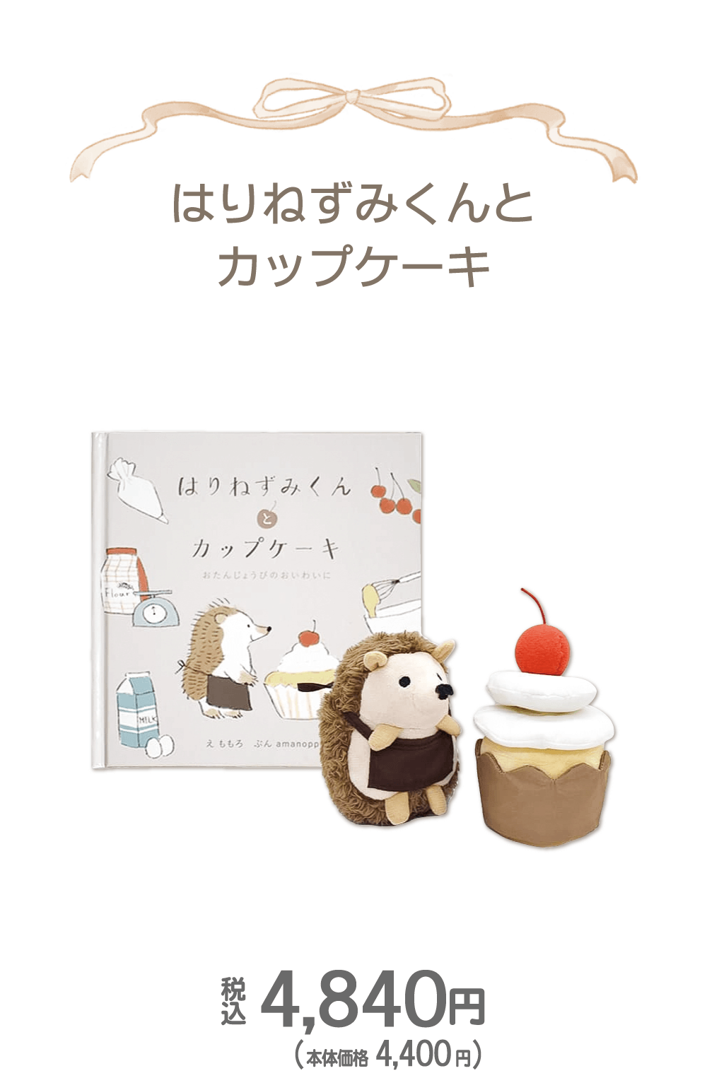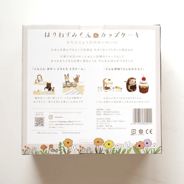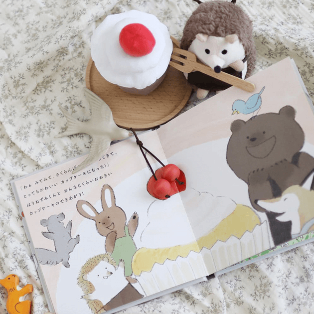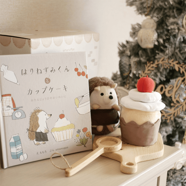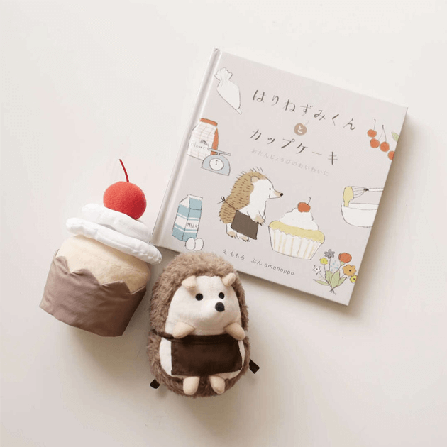えほんに出てくるはりねずみくんのぬいぐるみと、みんなで作った美味しいカップケーキのおもちゃがセットになっています。