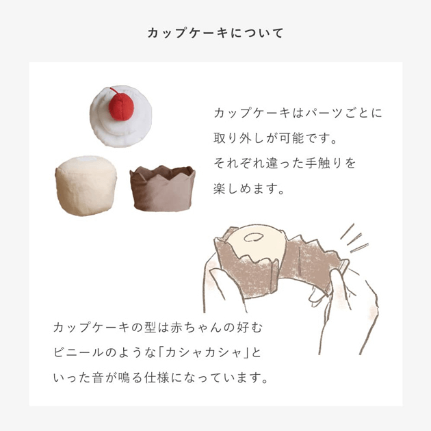 カップケーキはパーツが取り外し可能で、 パリパリ、カシャカシャと赤ちゃんの大好きな音が鳴ります♪