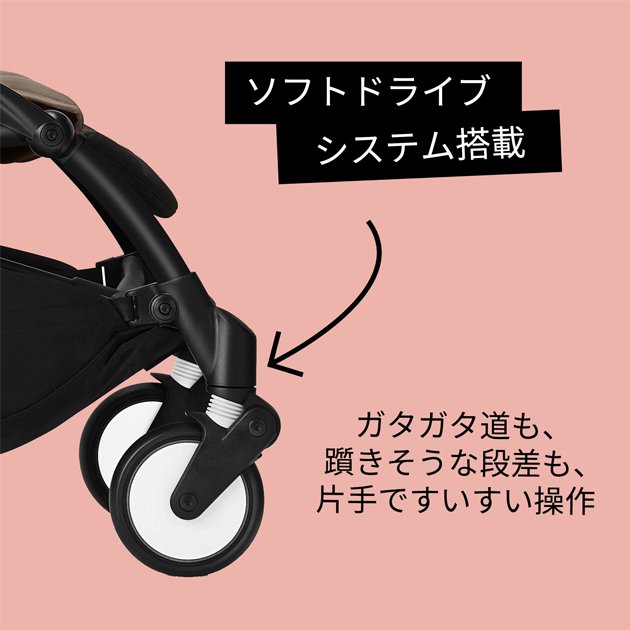 ・特許を取得したソフトドライブシステムが、前輪の向きをコントロールしてくれるので、片手でもすいすい走行。独自開発のサスペンションで衝撃を吸収し、スムーズな走行を実現