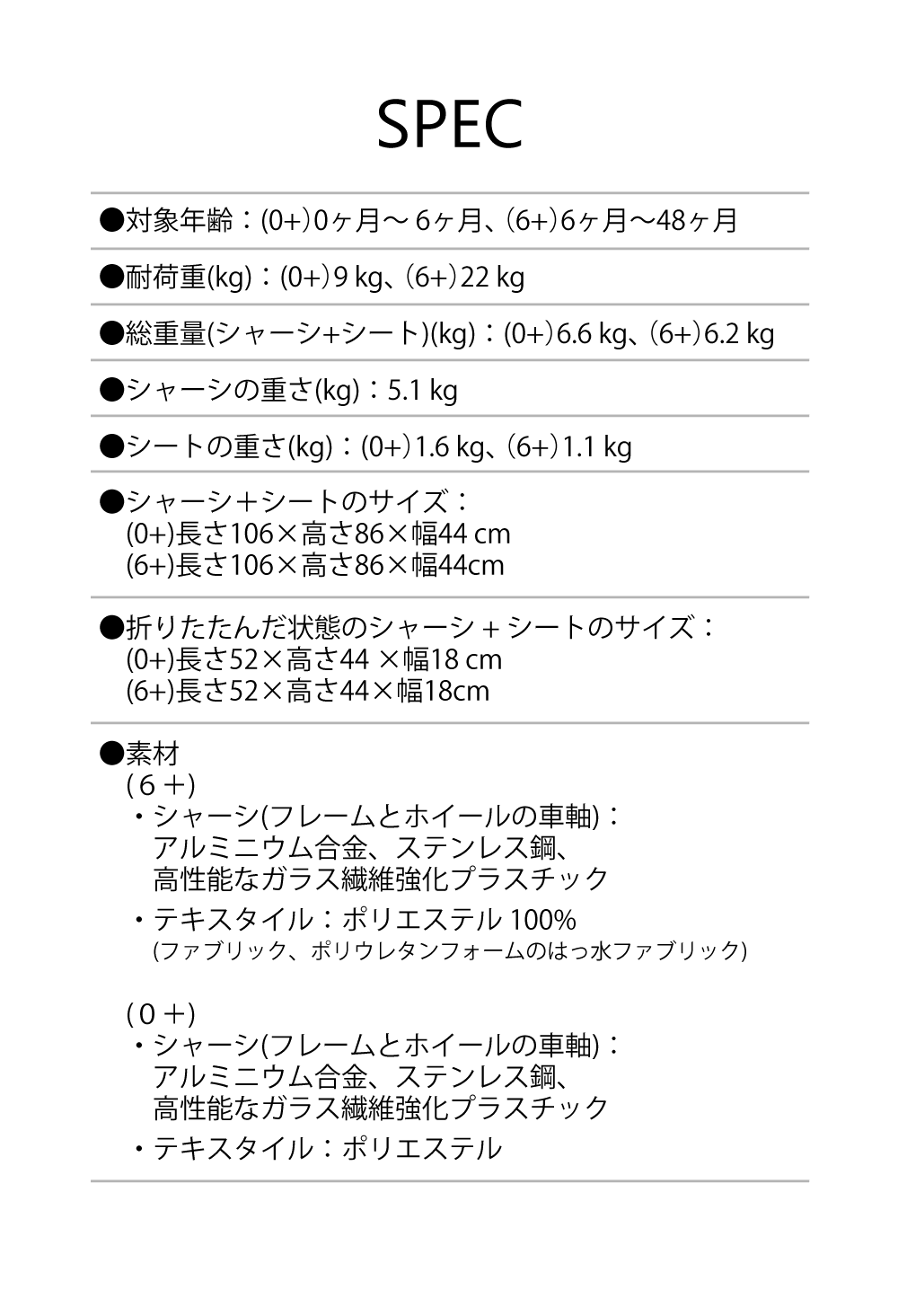 ・総重量(新生児用 0+ カラーパック + シャーシ kg):6.6 kg