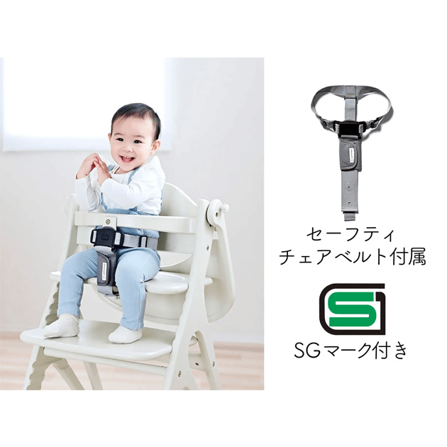 ・「アッフル ソルベ チェア」では、セーフティチェアベルトが付属しています。お子さまがたっちを覚えると、椅子のうえに立つようになります。そんなときにセーフティチェアベルトがあると、立ち上がりにくくなります。 もしもの落下防止にもなり安全を認められてSGマークがついています。