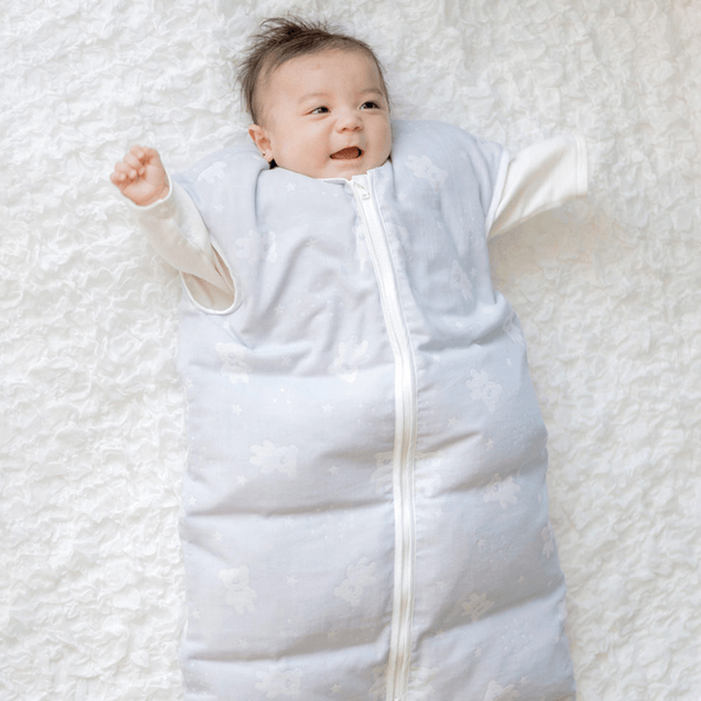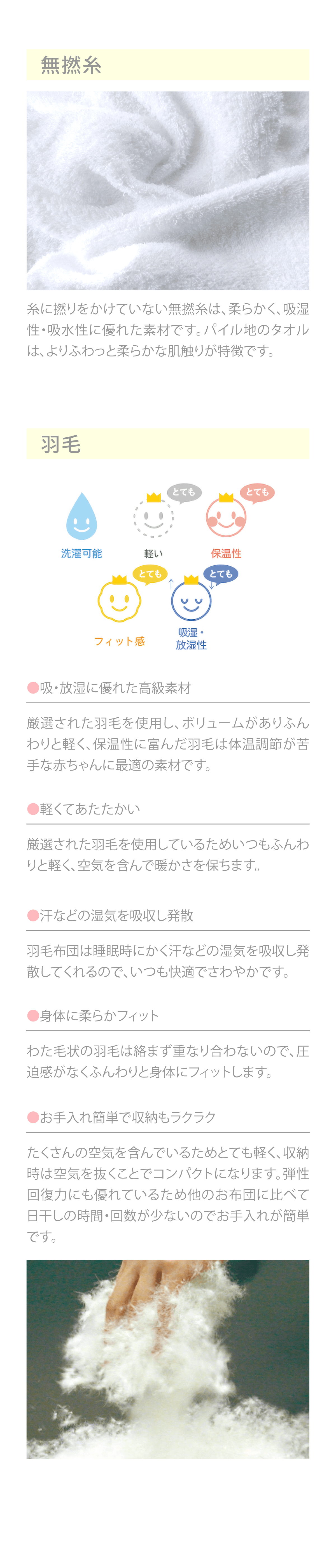 ふんわり軽くて暖かい羽毛のスリーパーです。 赤ちゃんの動きを妨げないゆったりとしたデザインで、 おなかが出ない長めの丈は、ねんねでお布団を蹴ってしまう赤ちゃんにも安心してお使い頂けます。 着せ替えしやすいファスナーの前開きタイプです。