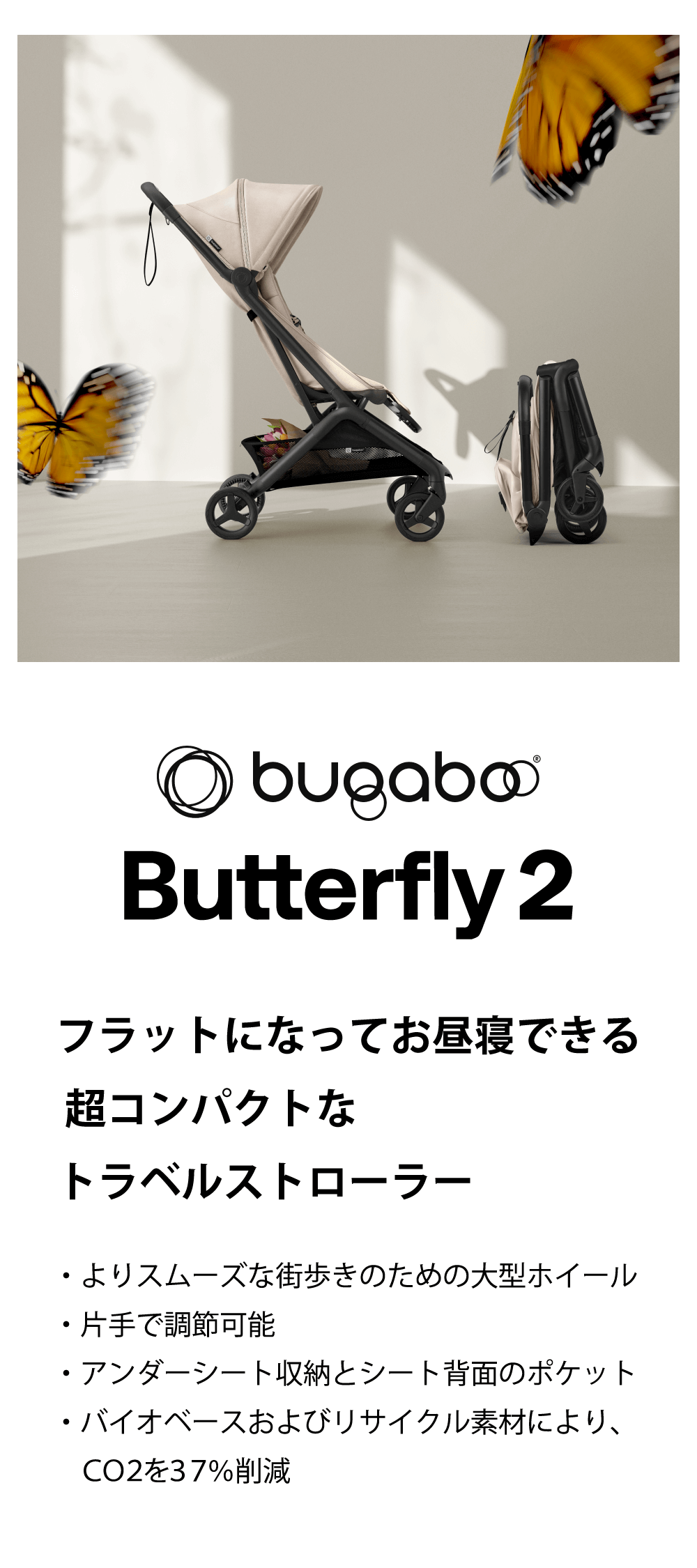 「バタフライ2 バンパーバー」はワンクリックでベビーカーのフレームに取り付け可能。 赤ちゃんをより安全に保護して快適さを提供するので、あなたも旅を安心して楽しむことができます。Bugaboo Butterfly2(ベビーカー) はこちら ス ※付属のButterfly 2アダプターを取り外すことで、 Bugaboo Dragonflyにもお使いいただけます。 ご注意事項:モニターの発色の具合によって実際のものと色が異なる場合がございます。ご了 承ください。