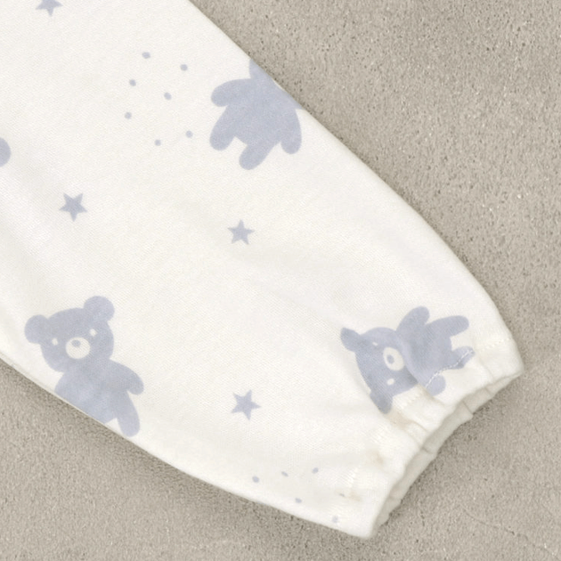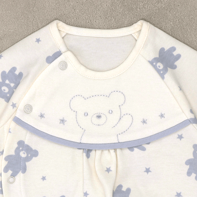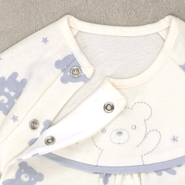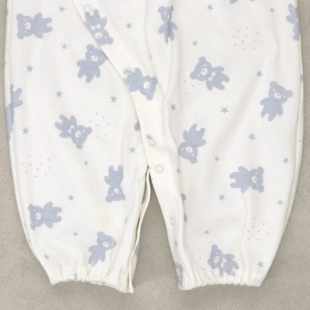 人気のデザイン「スターベア」シリーズのプリントが、元気いっぱいの赤ちゃんによく似合います。やわらかくなめらかなスムース素材で、秋から春先まで活躍します。生まれてすぐは足を包むドレスタイプ。足をばたばた出来るようになったらボタンを留め替えて、カバーオールタイプにもなるツーウェイ仕様です。