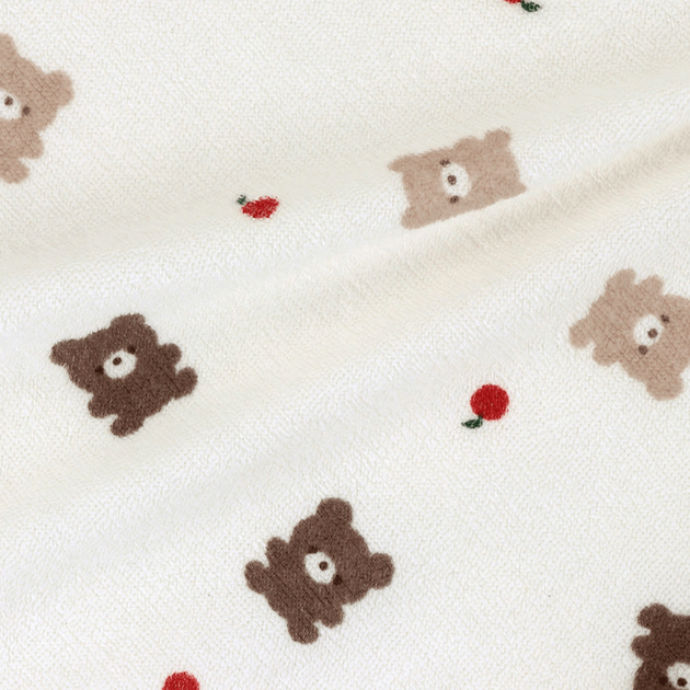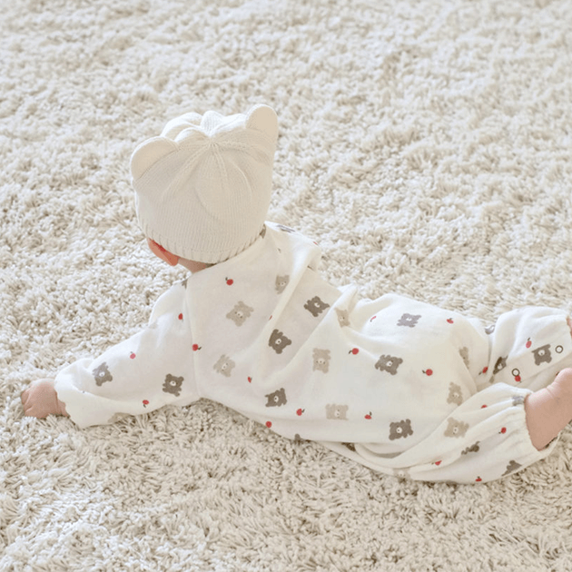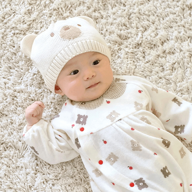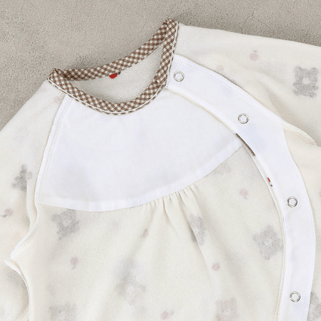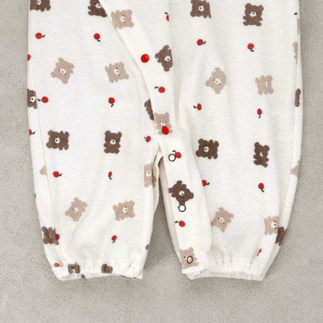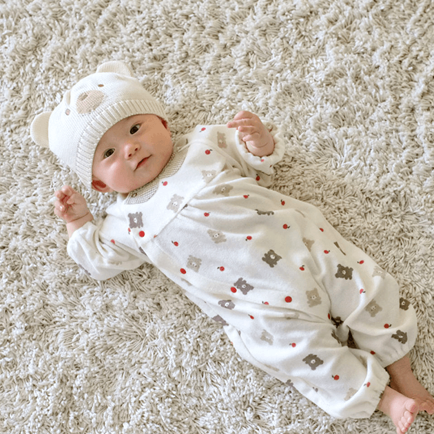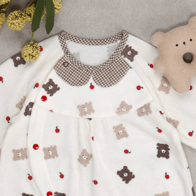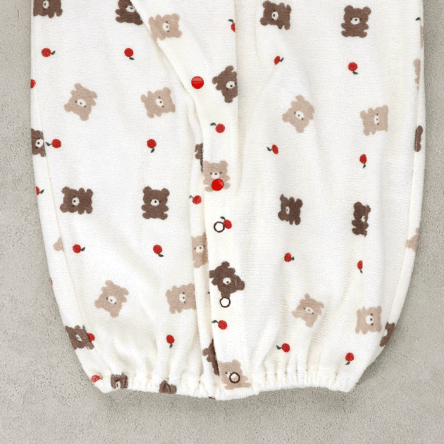 くまの可愛いプリントのパイル生地。やわらかで肌への刺激が少なく、 赤ちゃんのデリケートな肌にもやさしい素材で秋から春先まで活躍します。 生まれてすぐはすっぽり足を包むドレスタイプ。 足がばたばたできるようになったらボタンを留め替えてカバーオールタイプにもなるツーウェイ仕様です。