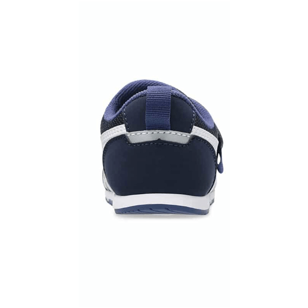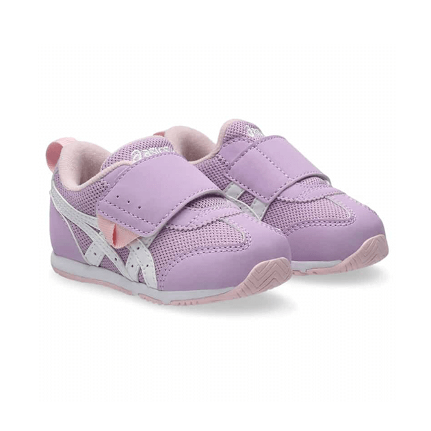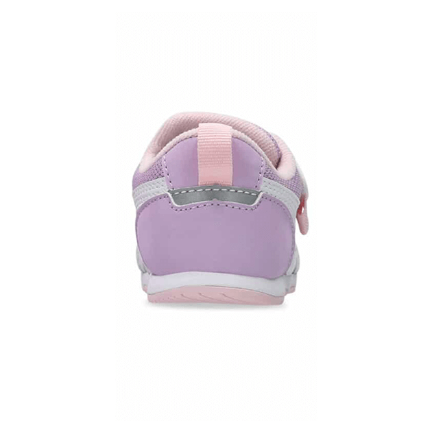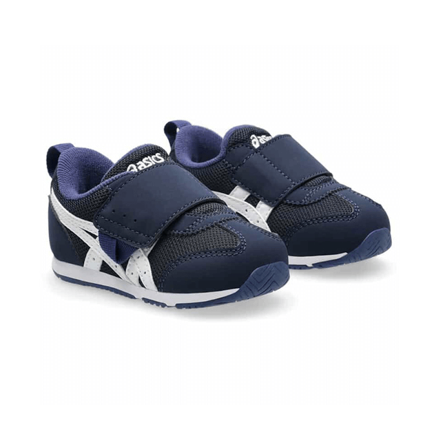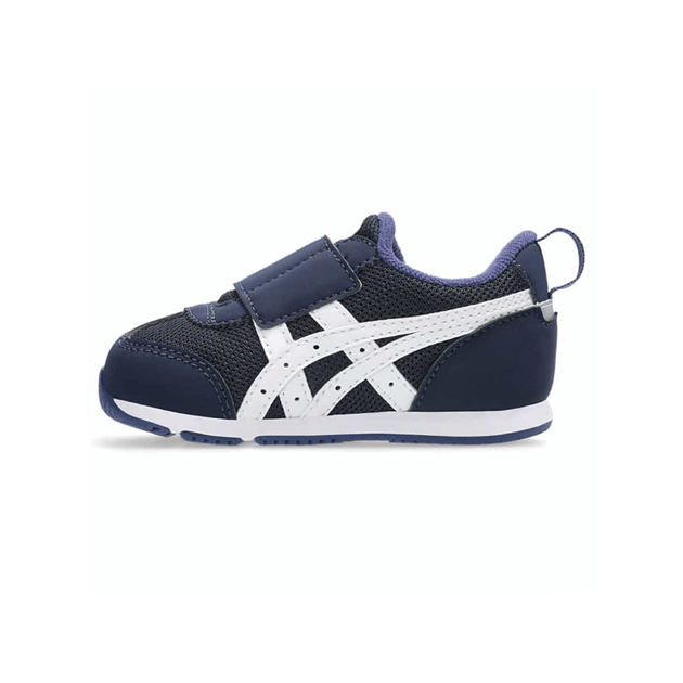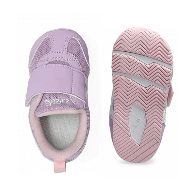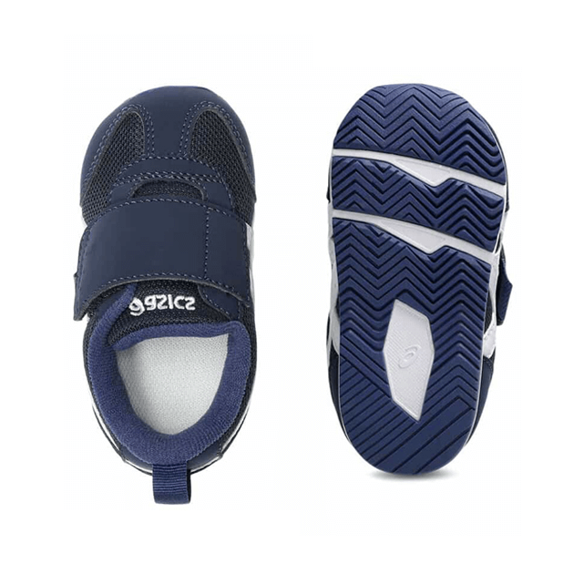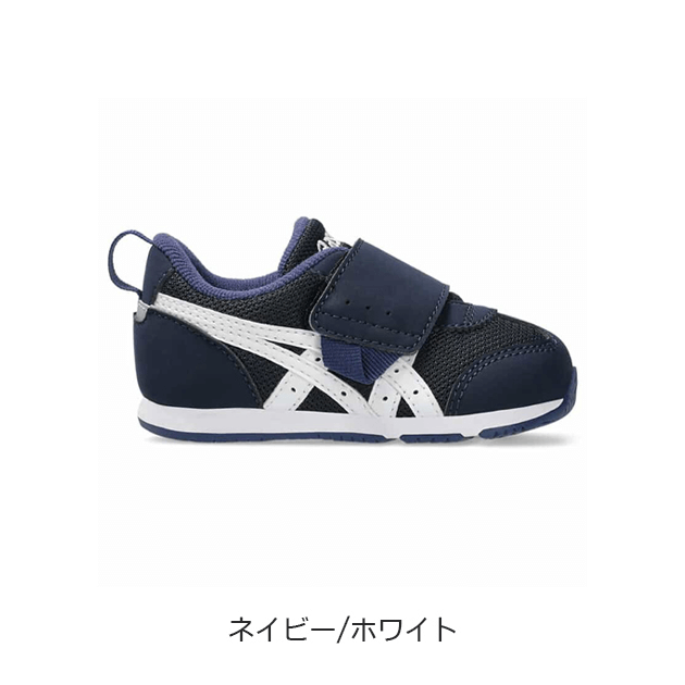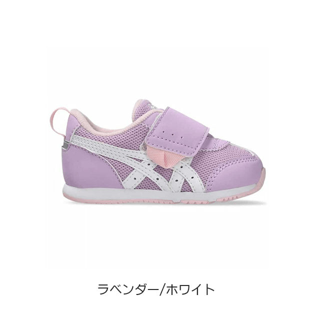 約1歳から3歳の幼児向けに展開する「BABY」シリーズのローカットシューズ。扇形のつま先部分は足ゆびをのびのびと動かすことができ、踏ん張りやすいのが特徴です。アウターソールは、足の屈曲位置に合わせて溝を配置した「フレックスグルーヴ」を採用。足の動きにしなやかに追従します。かかとの安定性を重視し、かかとを包み込む立体的なインナーソールを使用しています。インナーソールの表面材には抗菌・消臭効果のあるシャインアップと、汗をすばやく吸収・拡散してドライ感を保つウォーターマジックを採用。靴の中を快適に保ちます。甲の内側を1枚の布で包み込むような構造のキモノフィットタンにより、フィット感を高め、アーチ部の倒れ込みを抑えます。アッパーは通気性に優れたラッセルメッシュを使用。街灯や車のライトなどの光を反射する再帰反射材(リフレクター)をかかと部に配置しています。