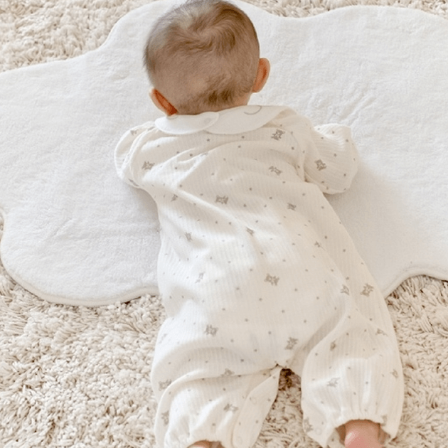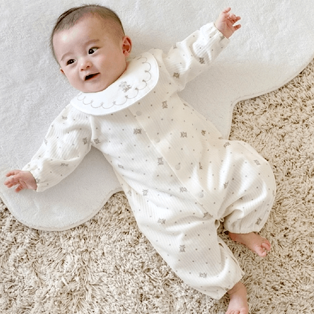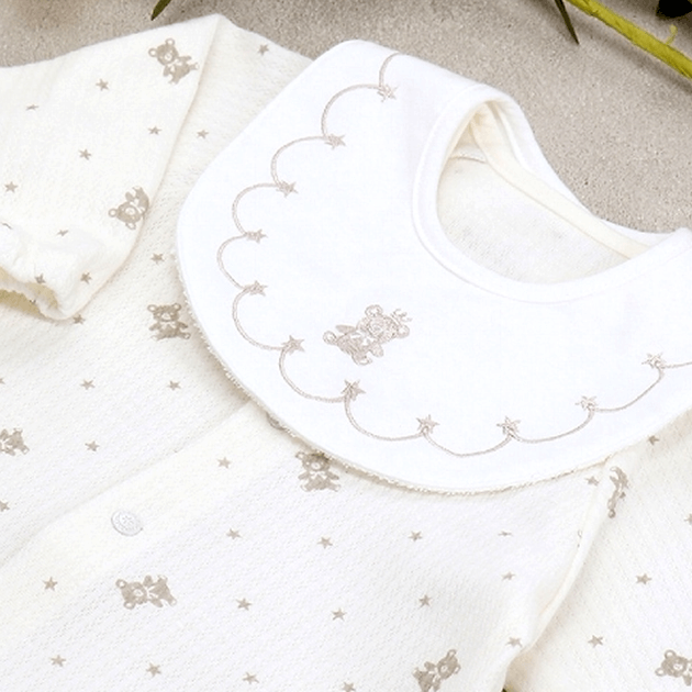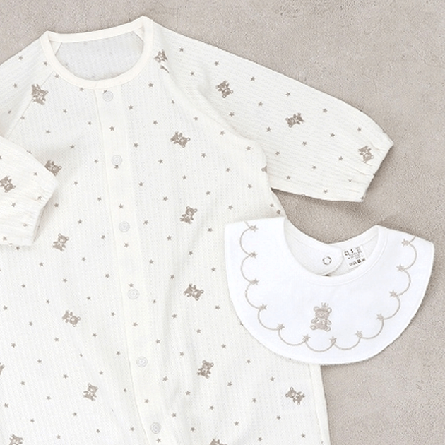 グレージュの上品なくまさんがかわいいプリントです。2枚の生地を合わせた接結素材は、空気を含んでふんわりやわらかく暖かいので、肌寒い春先や秋冬シーズンに最適です。スタイは取り外し可能なので、いろんなコーディネイトができます。生まれてすぐはすっぽり足を包むドレスタイプ。足がばたばたできるようになったらボタンを留め替えてカバーオールタイプにもなるツーウェイ仕様です。