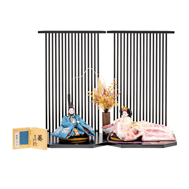 青地の着物にリボンの刺繍が愛らしいお殿様。白から桃色に変化する華やかな生地に桜の刺繍のお雛様。上品な一品です。