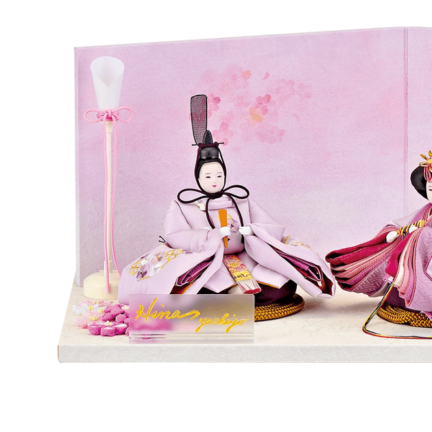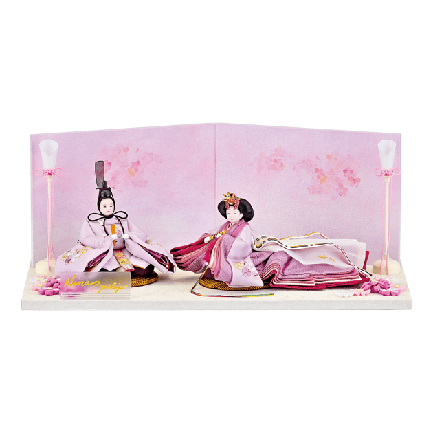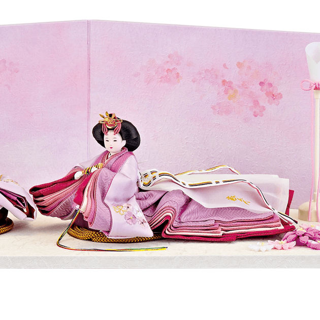 雪の結晶を施した雪輪に桜の刺繍が施された可愛らしいお雛様。飾り台には縮緬つまみ細工がちりばめられています。