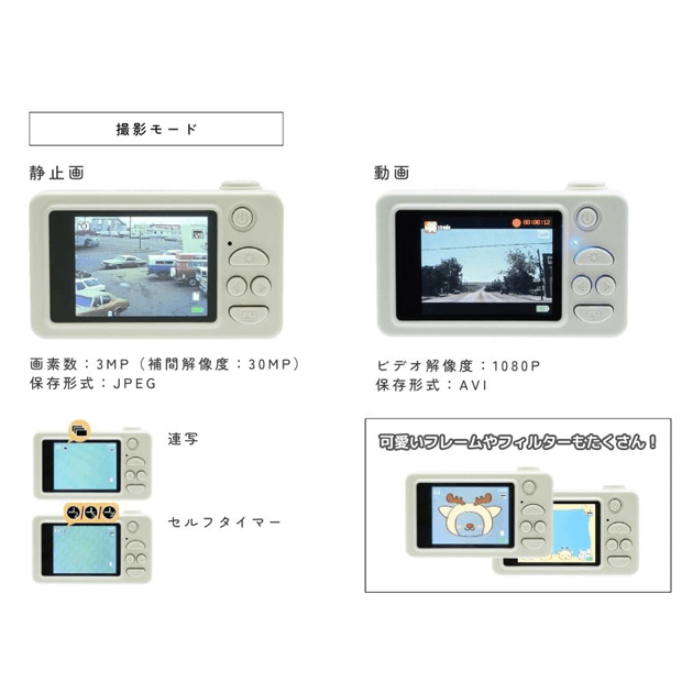 静止画は画素数300万pixel(補間解像度3000万pixel)、動画はビデオ解像度1080pixelと十分に楽しめる画質で、静止画は連写やセルフタイマー、フレームやフィルターが使用できます。