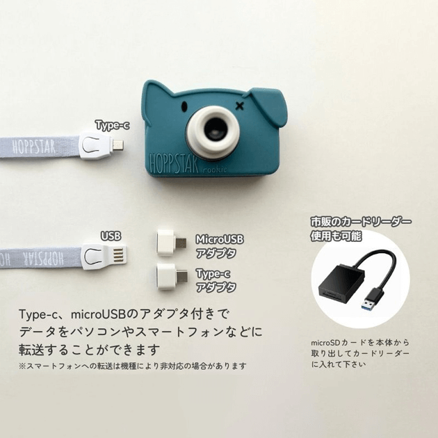 type-c、MicroUSBのアダプタ付属で、USB側の端子に取り付けることでパソコンやスマートフォン、HDDレコーダーなどにデータを転送することができます。