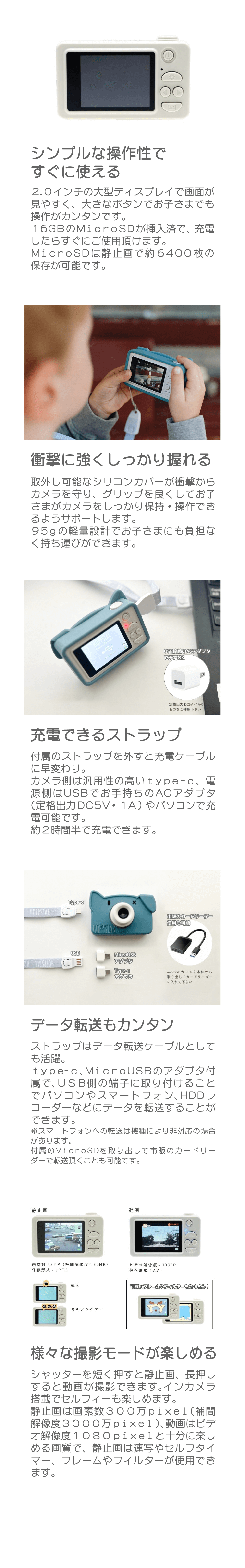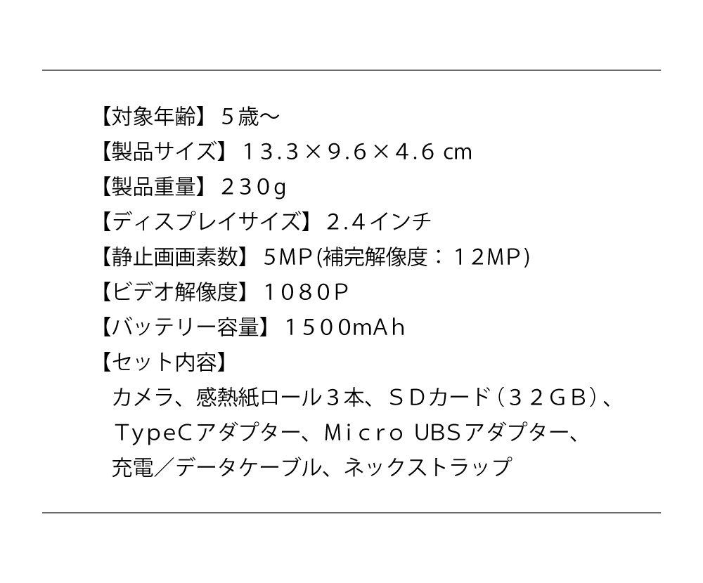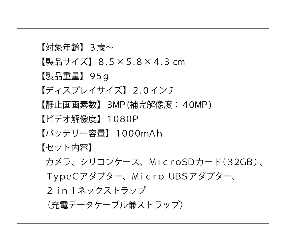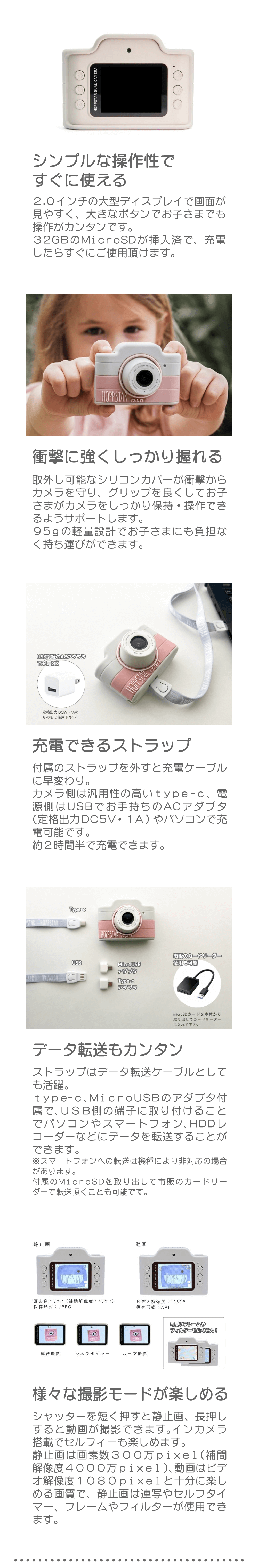 ゲームなどのカメラ以外の機能は備えず撮影に没頭でき、洗練されたデザインと機能性で子どもと世界をつなぎます。