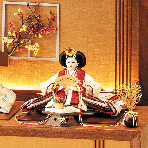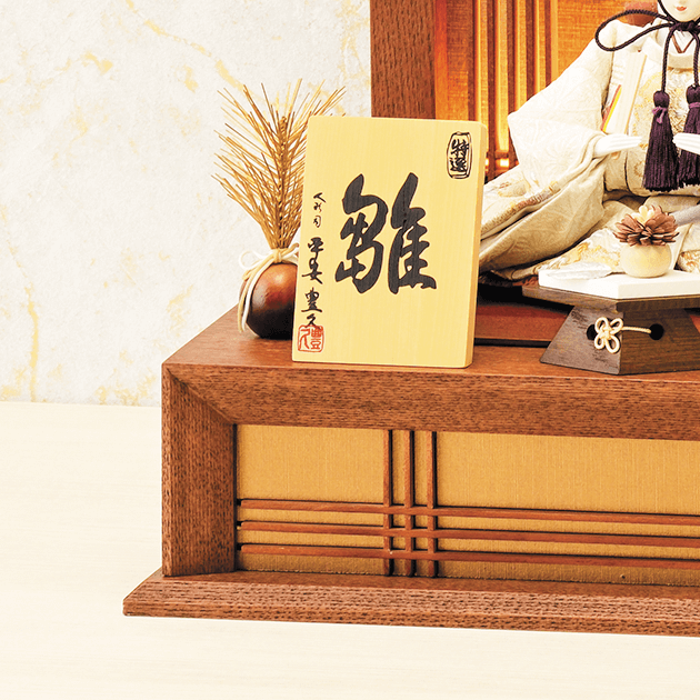 雪輪の刺繍を施したお雛様です。屏風に施された南天の飾りは「難を転じて福とする」ということから古来より魔除けの意味があります。