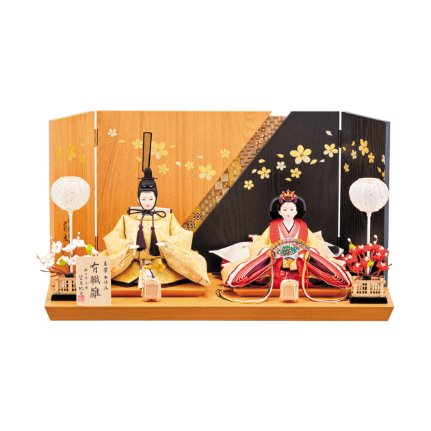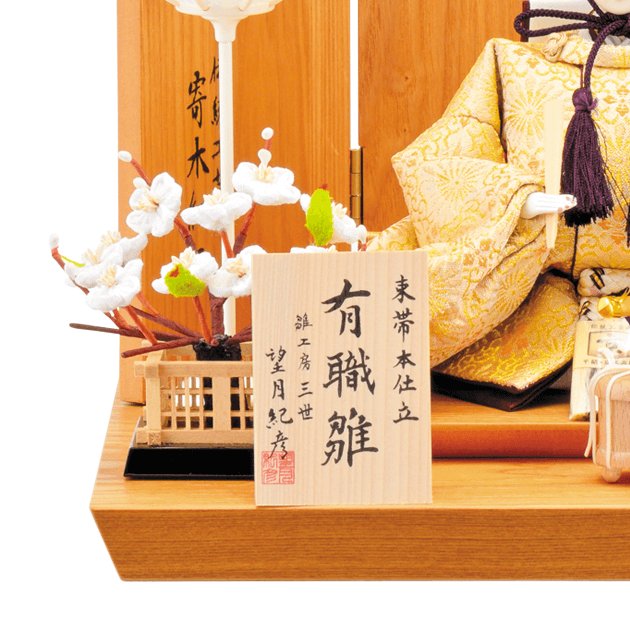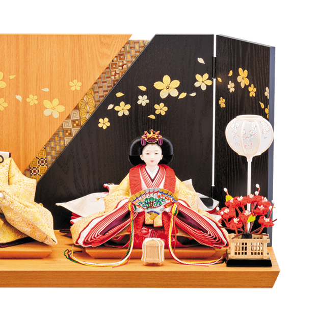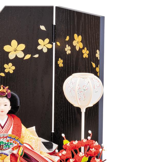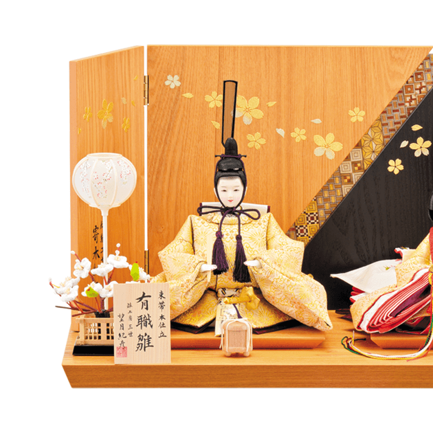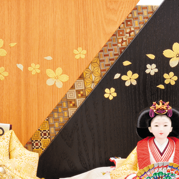 金地に菊の花をあしらった「菊花紋」を施した華やかなお着物のお雛様です。桜の蒔絵と寄木細工の屏風がとてもよく合うセットです。