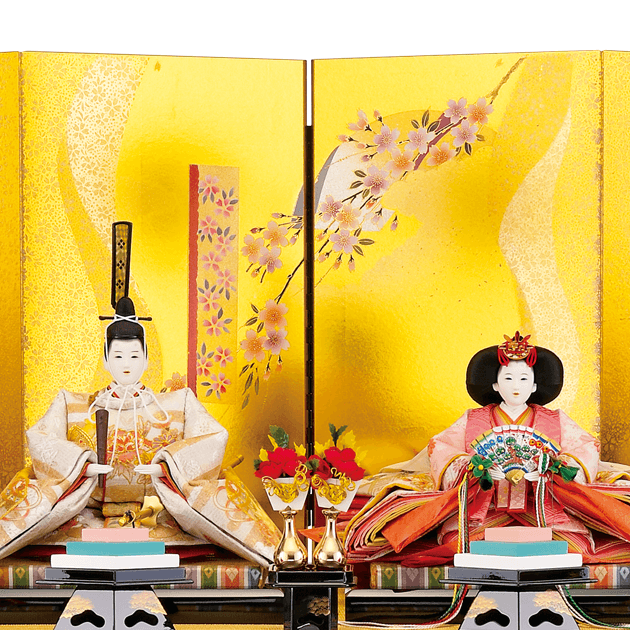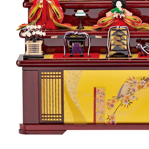 華やかな金彩京刺繍を施した五人飾りです。ボリュームのある仕立ては、松寿奈良では.一つ一つが丁寧な仕上がりです。
