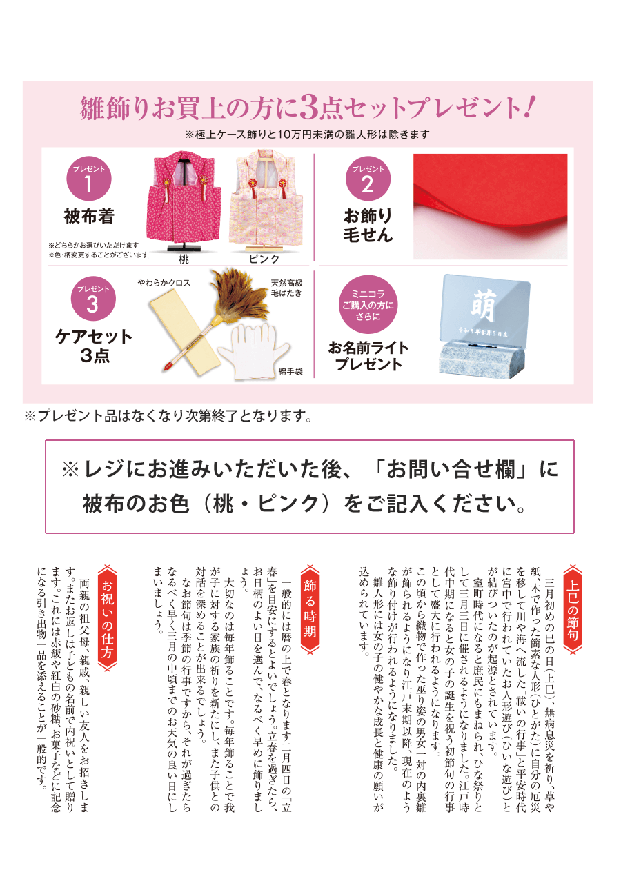 ひな人形をご購入のお客様に、ケアセットなど3点セットプレゼント!