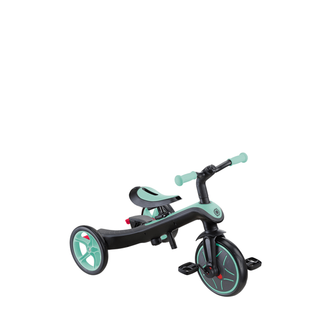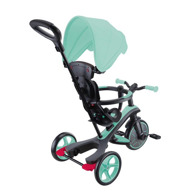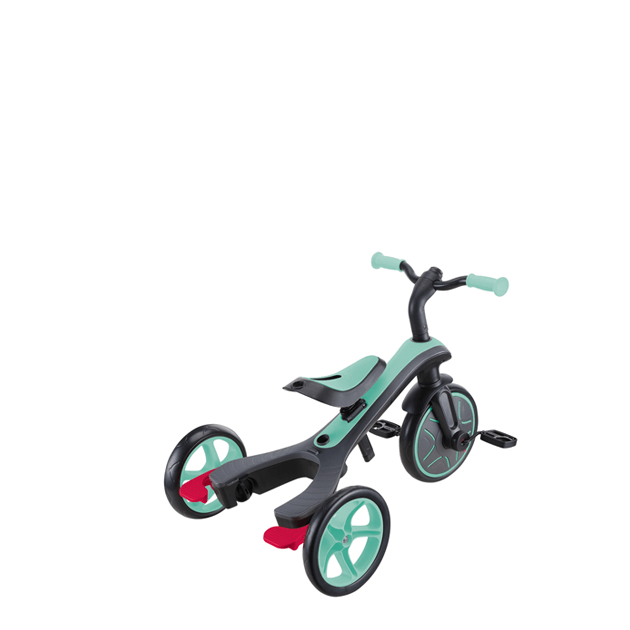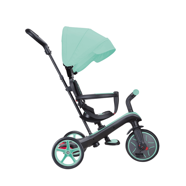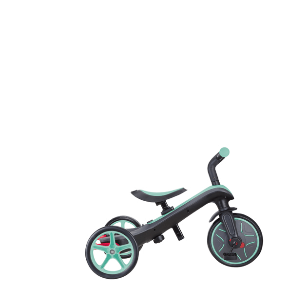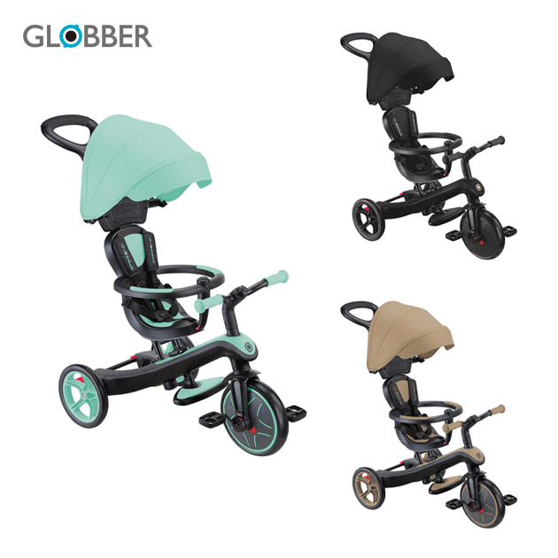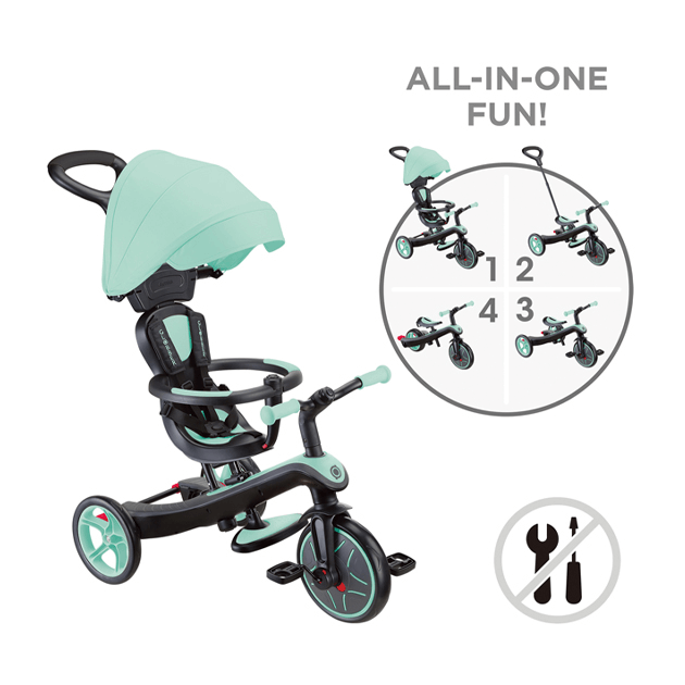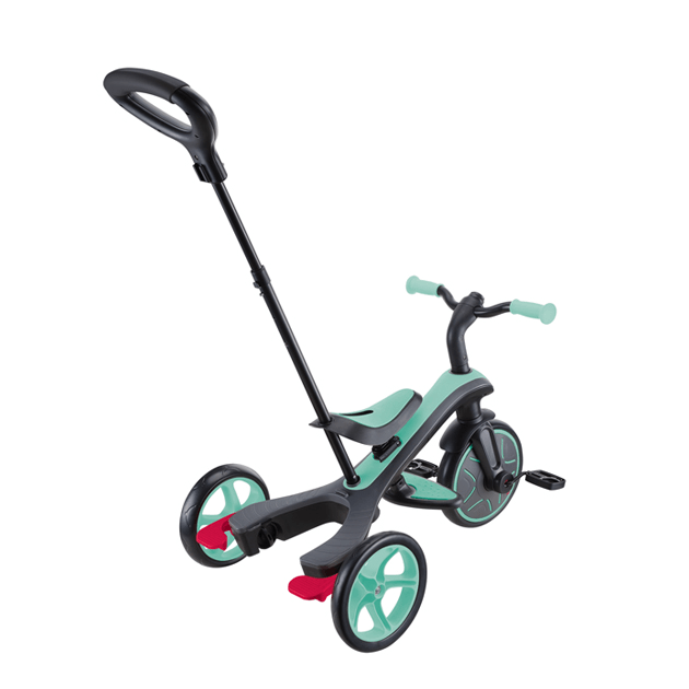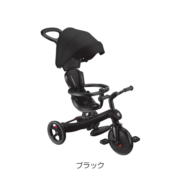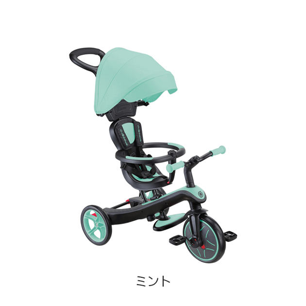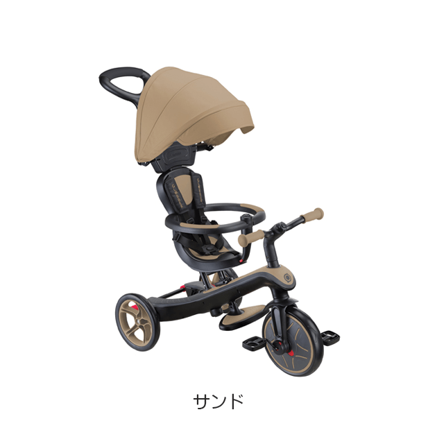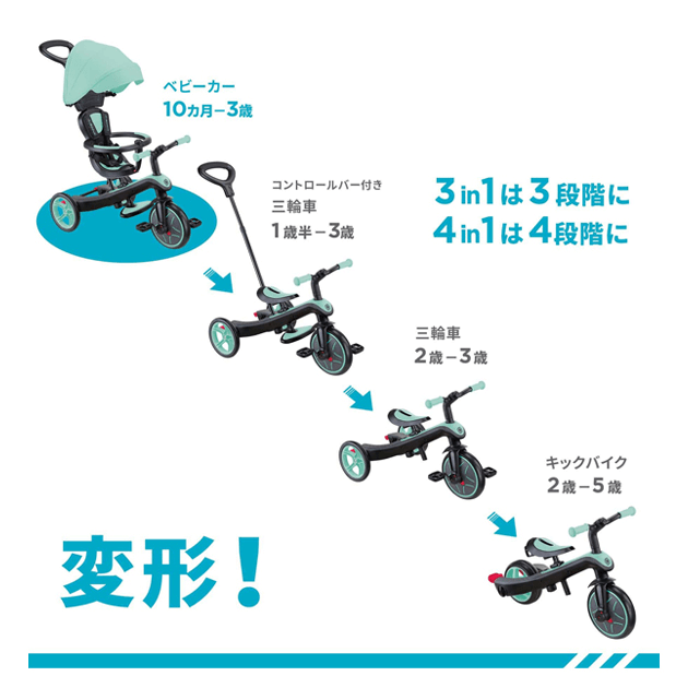 大人が押して進むベビーカーからコントロールバー付き三輪車、自分で操作して楽しむ三輪車から二輪のキックバイクへ工具不要で変形。