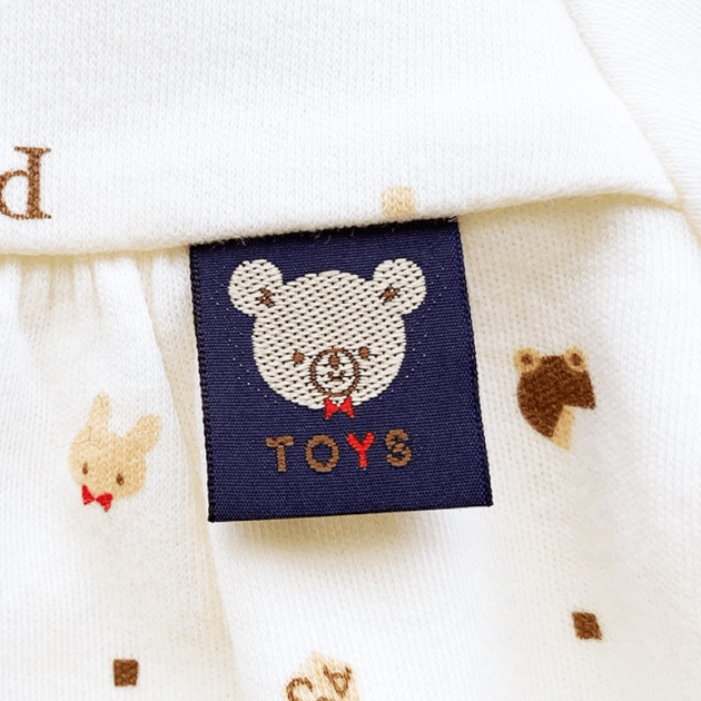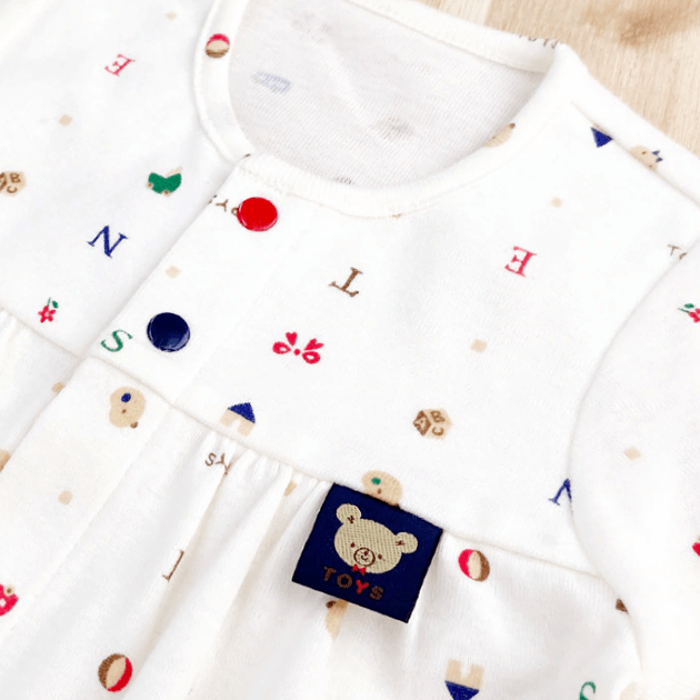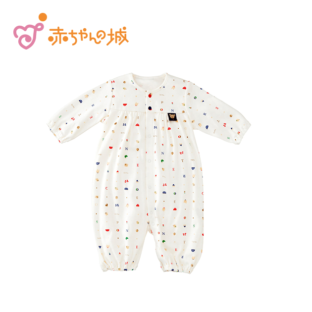 かわいいどうぶつとおもちゃが並んだ優しいアイボリー色のデザインで男女問わず着て頂けるアイテムです。オールシーズンお使い頂けるフライス素材は、伸縮性があり、肌にフィットして汗を吸収してくれます。生まれてすぐは足を包むドレスタイプ。足をばたばた出来るようになったらボタンを留め替えて、カバーオールタイプにもなるツーウェイ仕様です。