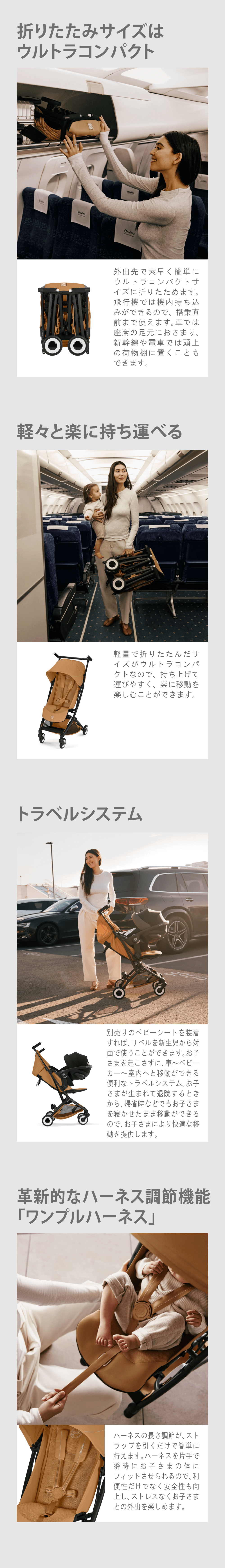 ハーネスを片手で瞬時にお子さまの体にフィットさせられるので、利便性だけでなく安全性も向上し、ストレスなくお子さまとの外出を楽しめます。