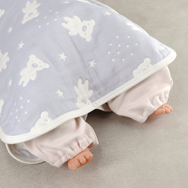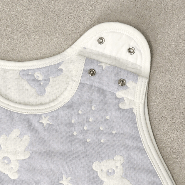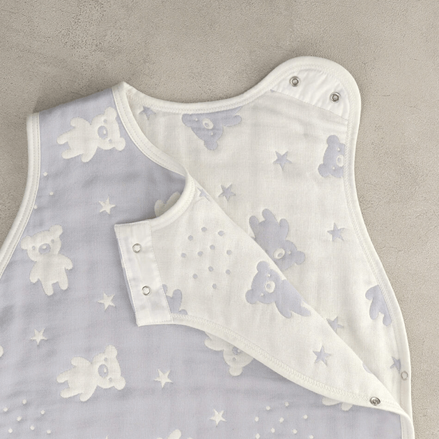 おなかが出ないスリーパーは、寝冷え対策に最適。長く使えるので、ギフトにも人気のアイテムです。両脇と肩のボタンで大きく開くので、寝かせたままの着せ替えも簡単です。股下のボタンを留めれば、裾がまくれ上がることもありません。