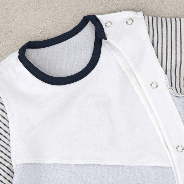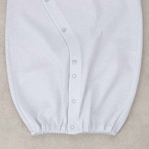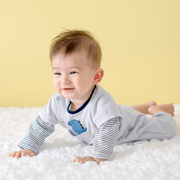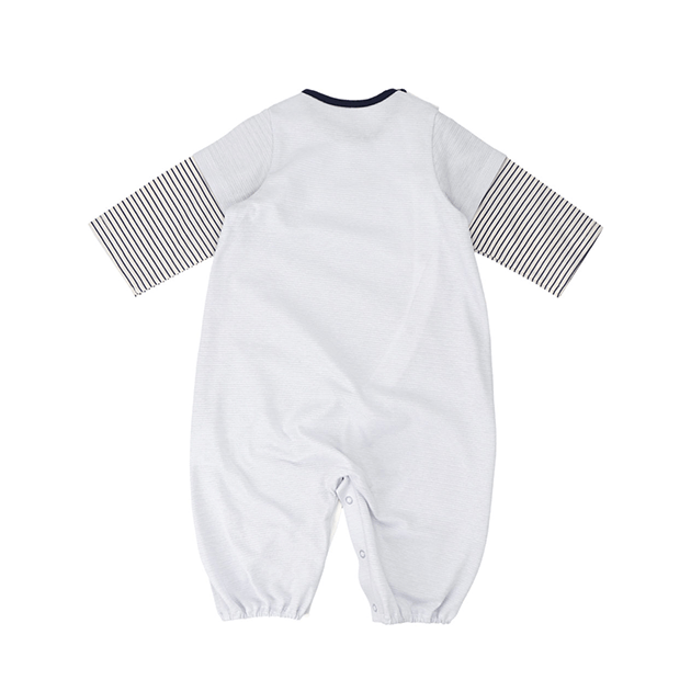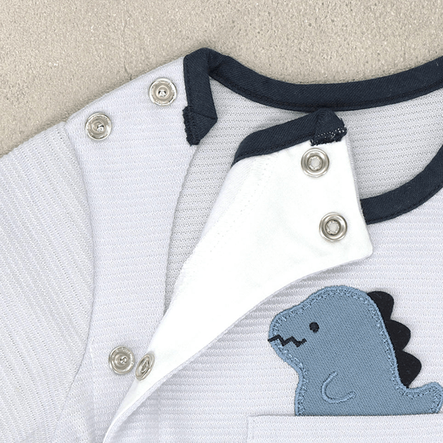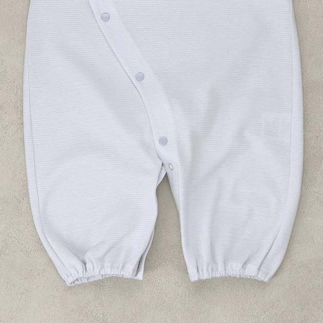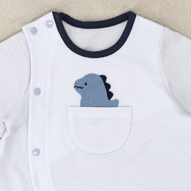 ポケットからのぞくきょうりゅうの刺繍がかわいいデザイン。ジャカードの天竺は軽くて薄い編地でさらっとした肌触りが気持ちいい夏用ウェアです。 生まれてすぐは足を包むドレスタイプ。 足をばたばた出来るようになったらボタンを留め替えて、カバーオールタイプにもなるツーウェイ仕様です。