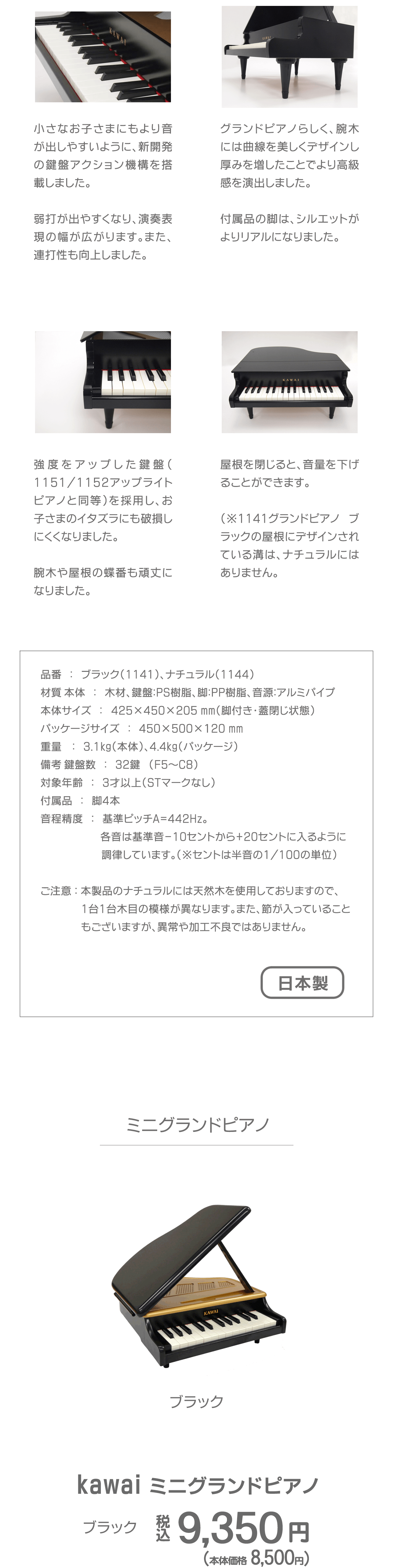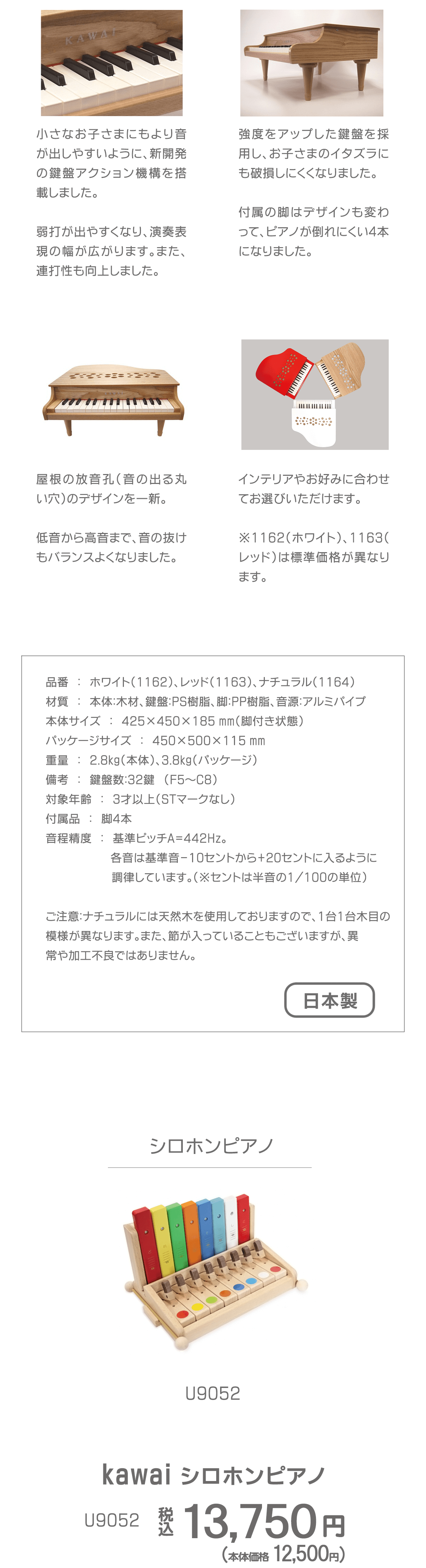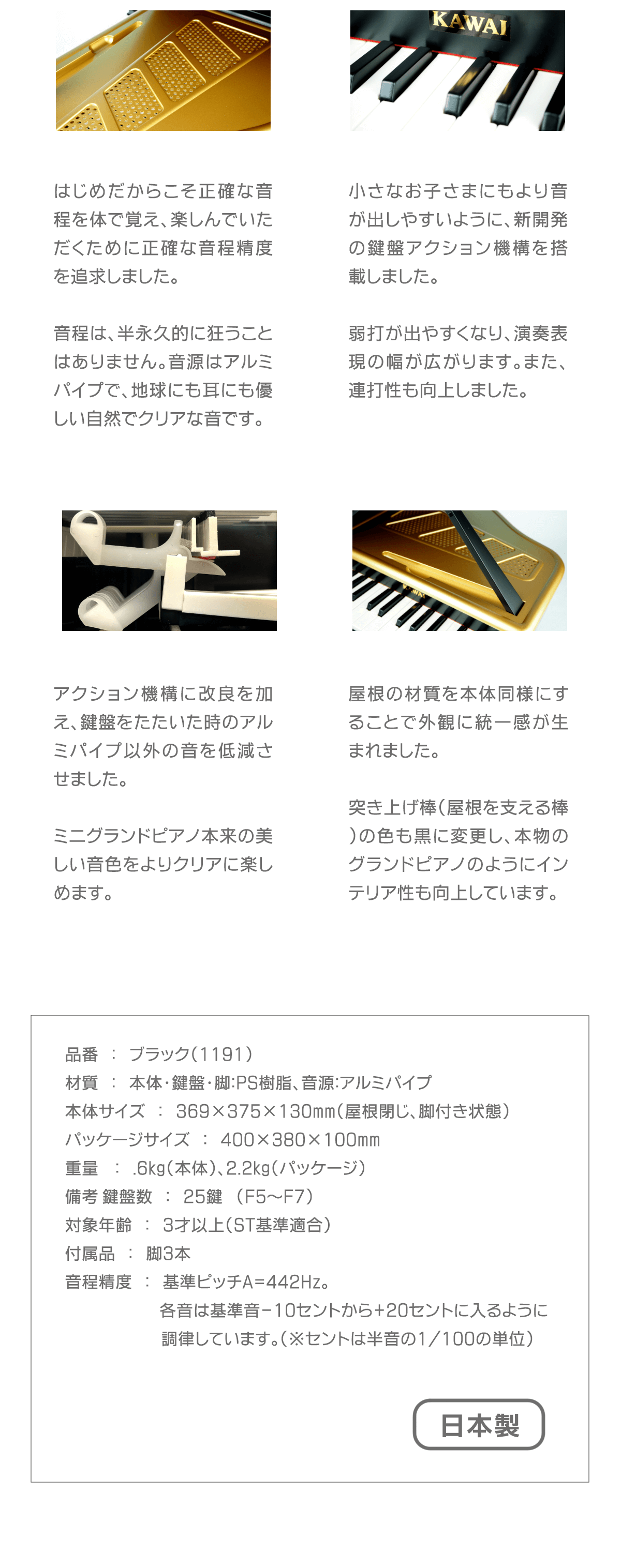 製品サイズ 約高さ211mm×幅297mm×奥行き184mm製品重量 1.5Kg製品材料:ケース:ムク、ブナ・音板:ポプラ・鍵盤:ブナ