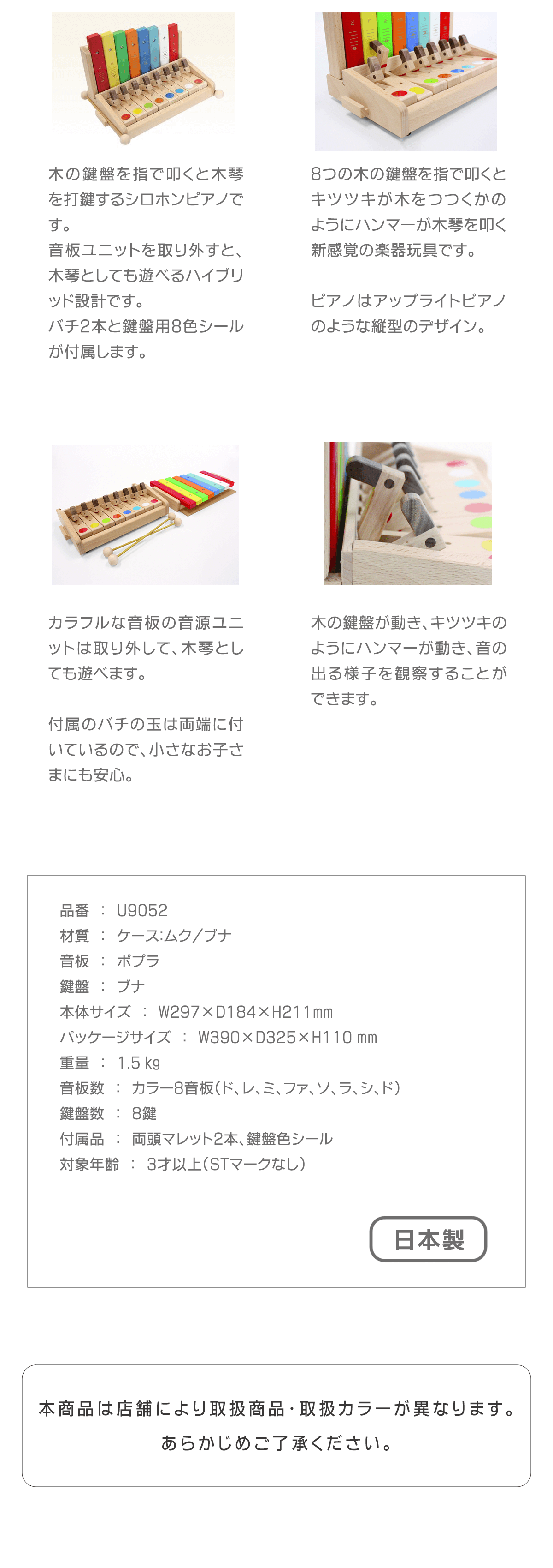 8つの木の鍵盤を指で叩くと、キツツキが木をつつくかのようにハンマーが木琴を叩く、新感覚の楽器玩具です。ピアノはアップライトピアノのような縦型のデザイン。鍵盤と木琴は1オクターブで、音程も正確にチューニングしています。木の鍵盤が動き、キツツキのようにハンマーが動き、音の出る様子を観察することができて音のなる仕組みがわかります。