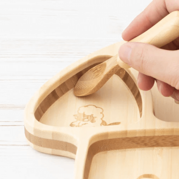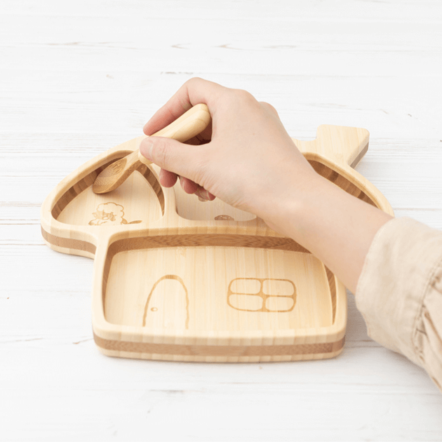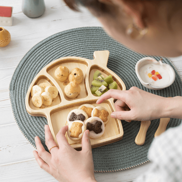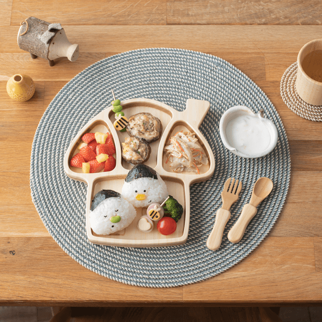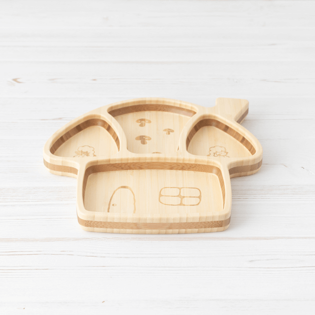 きのこのカタチのこびとのおうちのプレートです。ご出産のお祝いにおすすめです。変り種ですけど、意外と扱いやすいんです♪シンプルな仕切りで盛り付けもカンタンです。