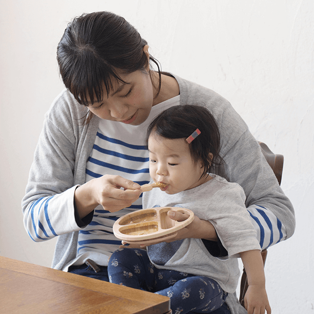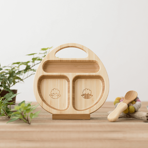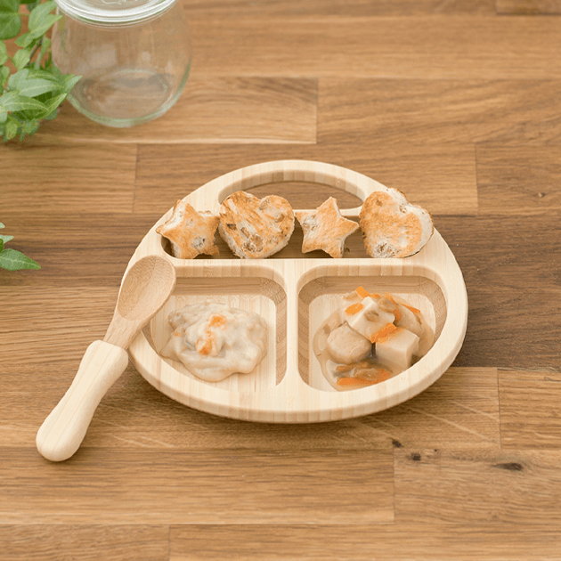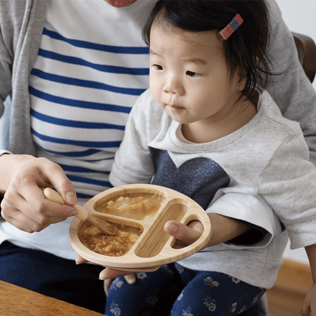 いざ、離乳食デビュー!ご出産のお祝いに最適な、離乳食のためのナチュラル食器です。パレットのようにパパやママが片手にもち、スプーンでたべさせてあげることができます。スプーンを収めるコーナーもついています。