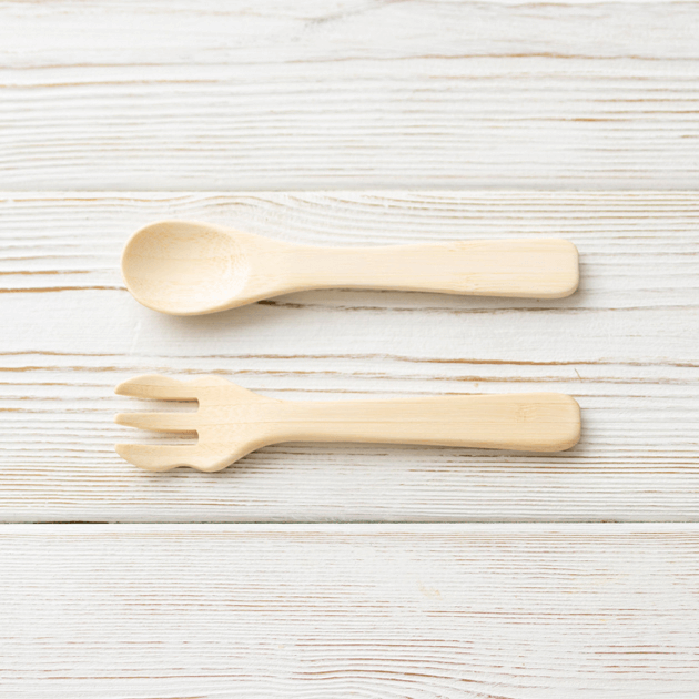いたってシンプルなスプーンとフォーク。ちょっぴり大きめで軽くて丈夫な竹食器♪やさしい口当たりのデザインです。