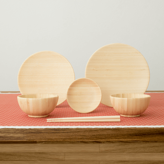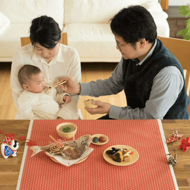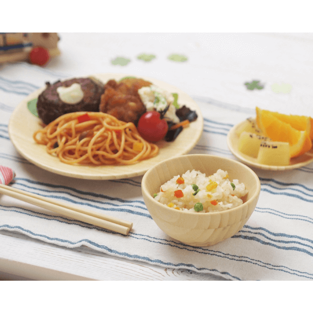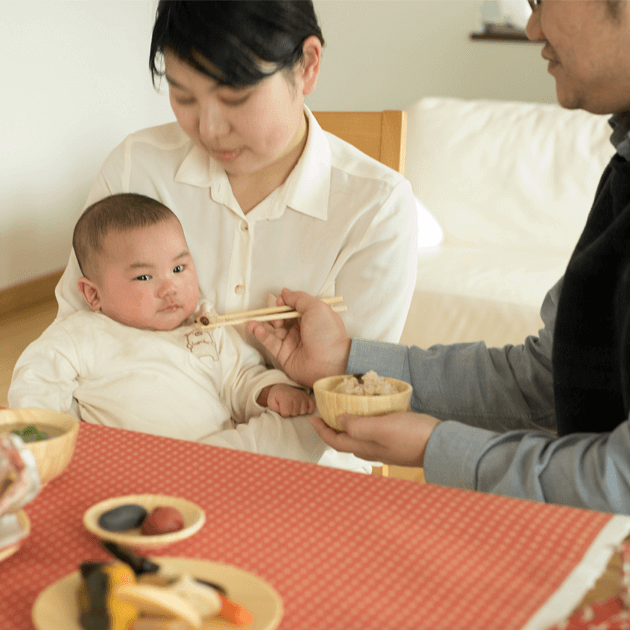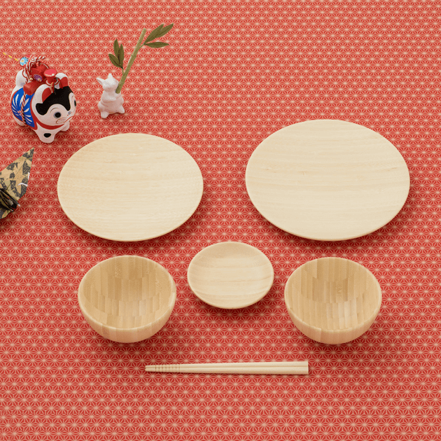 トレー、お椀×2、お皿×3、お箸。シンプルなお食い初め膳のセットです。