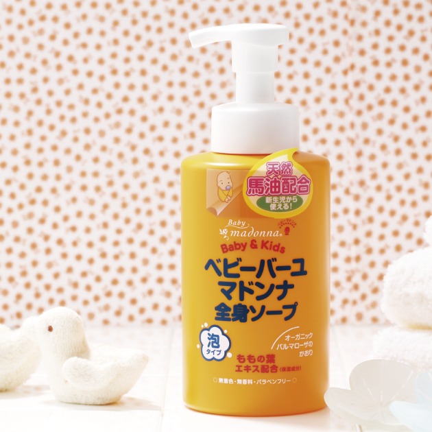 うるおい成分の天然馬油・天然ももの葉エキス・天然ビワの葉エキスと、オーガニックパルマローザを配合したふわふわ泡のベビーバーユ全身ソープ。なめらかでふわふわの泡が、赤ちゃんのお肌をやさしく洗い上げます。お肌にやさしい成分だから、体だけでなく赤ちゃんの洗顔にも使えます。髪の毛を洗う際にもご使用いただけます。 製品内容量 380ml 製品材料:天然馬油・ももの葉エキス・ビワの葉エキス配合 生産国:日本